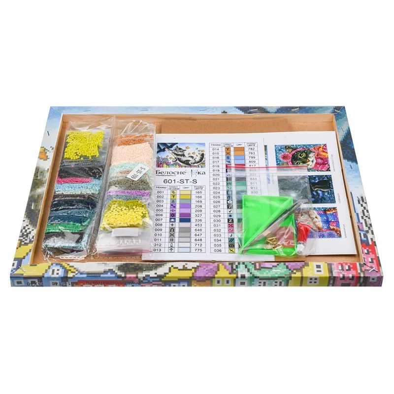 Заполняя цветную схему холста маленькими камешками, вы получаете интересное мерцающее изображение. Набор ярких искусственных камней на основе эпоксидной смолы расфасован по цветам в маленькие пакетики. На каждом из них имеется наклейка с номером цвета и условным обозначением. В комплект также входит лоток для камней, металлический пинцет и схема-ключ.