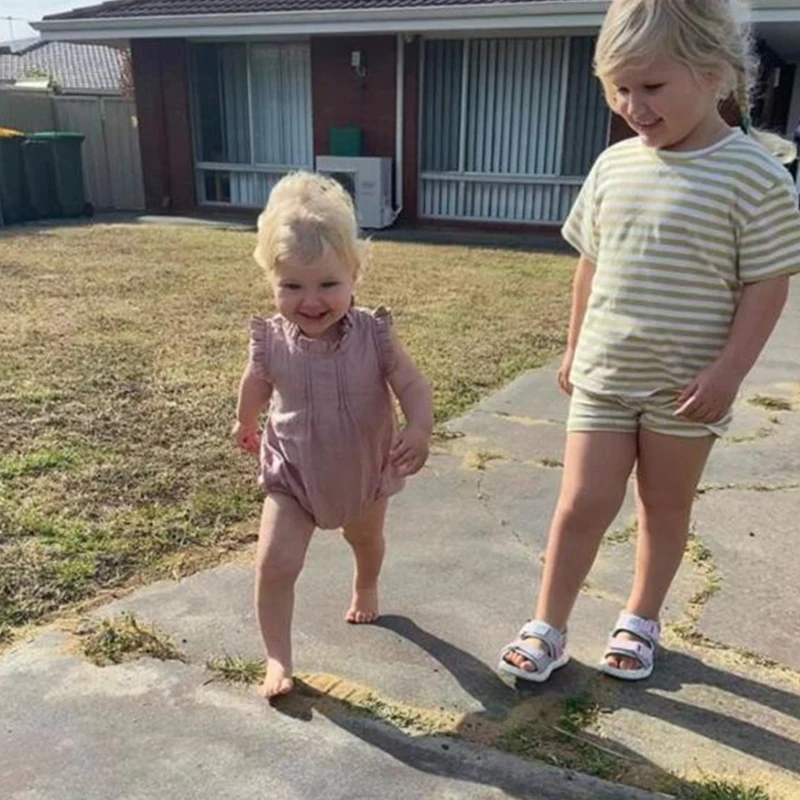 Летние однотонные комбинезон для новорожденных мальчиков и девочек; Ползунки из хлопка и льна боди модные гофрированные без рукавов; Комбинезоны для маленьких детей пляжная одежда