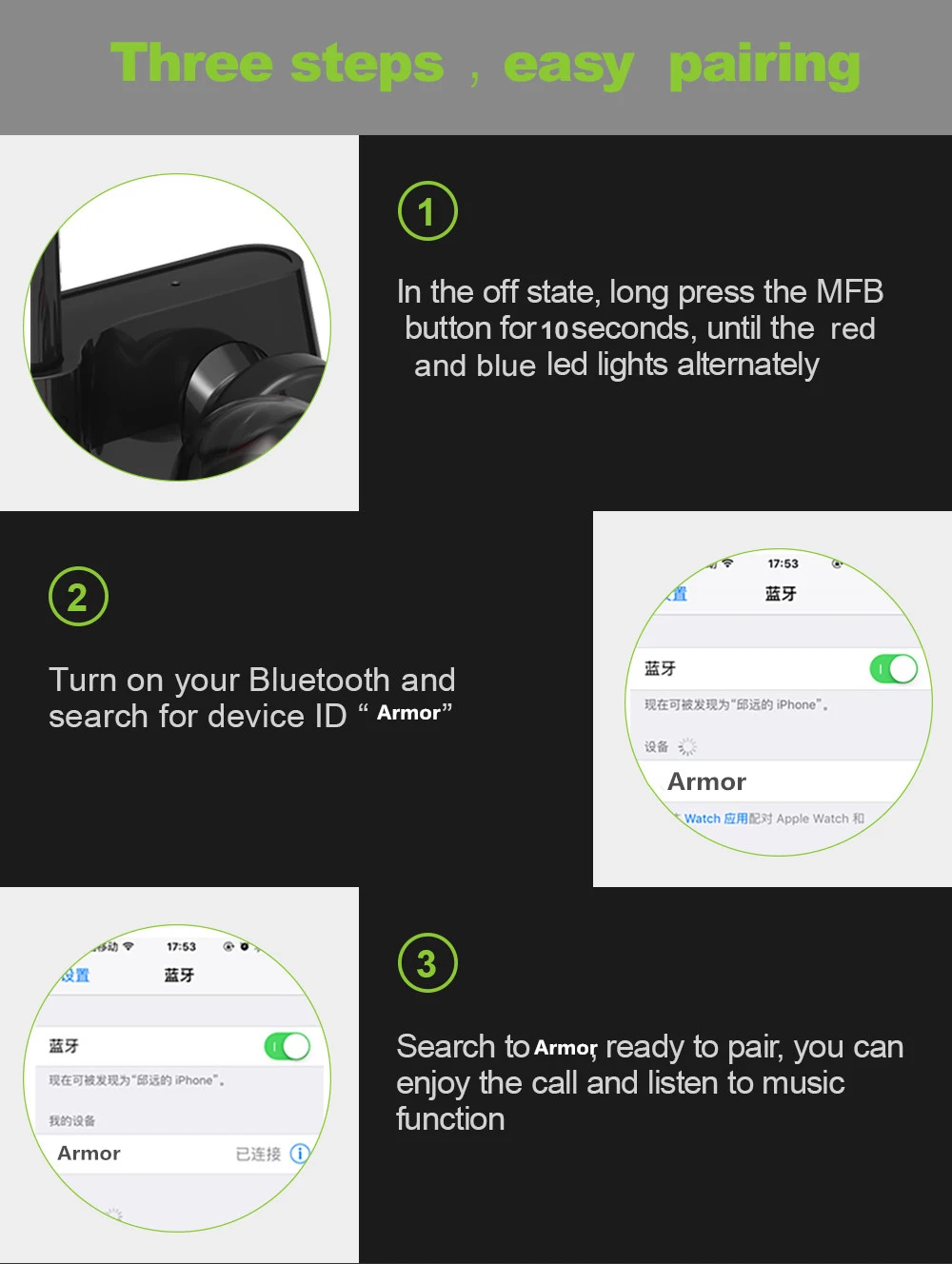Функции: воспроизведение музыки/пауза, ответ на вызов/отклонение, дисплей батареи IOS, автоматическое подключение, вызов siri и т. д.