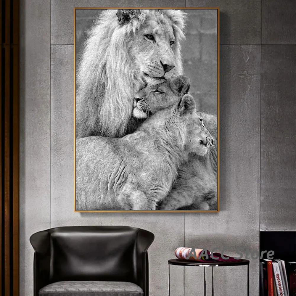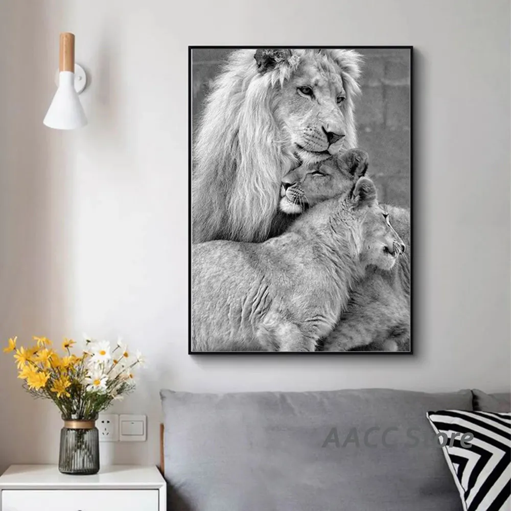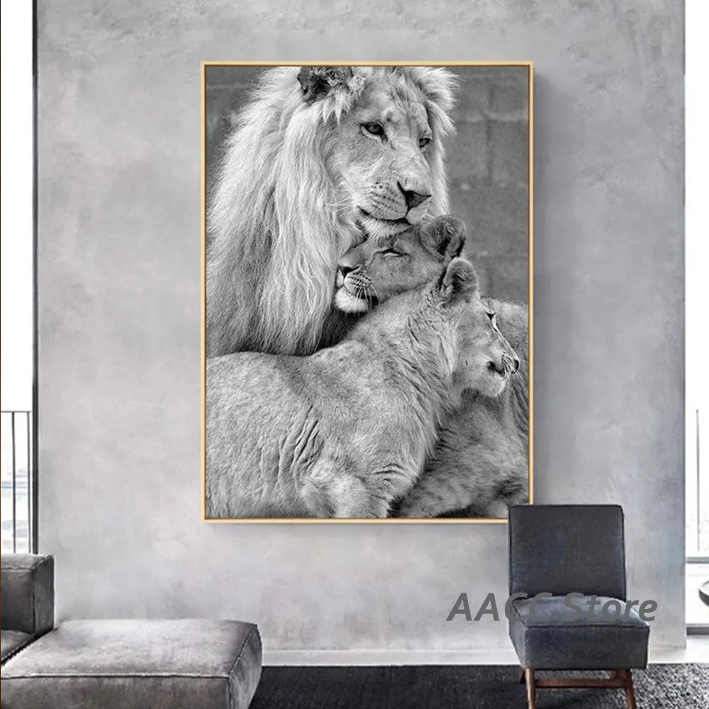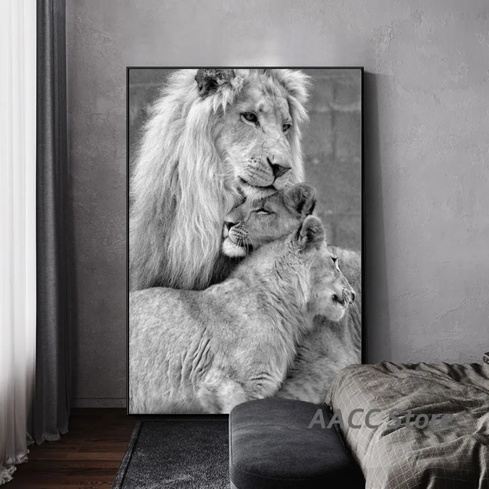 Картина на холсте с изображением Льва, отца с ним 2 Дети, семьи, черно-белые принты, картина для скандинавского декора дома