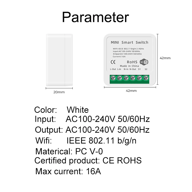 Цвет: белыйВход Напряжение: AC100-240V 50/60HZВыходное напряжение: AC100-240V 50/60HZWi-Fi: IEEE 802,11 b/g/n, 2,4 ГГцМатериал: PC V-0Сертифицированный продукт: CE ROHSМаксимальный ток: 16A
