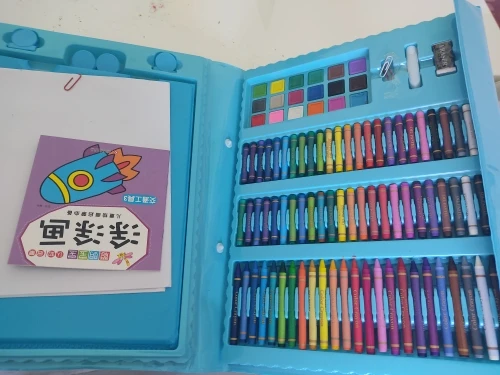 Набор включает фломастеры, мелки, палочки для рисования маслом, цветной карандаш, пирожные, нарисованные акварелью, бумагу, скрепки, палитру, ластик, губку, кисть, карандаш, клей и линейку, Всего 208 шт.