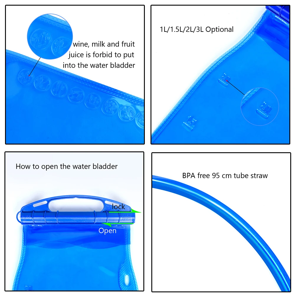 Пищевой одобренный FDA материал PEVA для мочевого пузыря, питьевая трубка с мягким отверстием, удобная для напитков. Водяной пузырь имеет герметичное отверстие с очень широким диаметром, что упрощает наливание воды или добавление льда. Вытяните резиновую горловину, и вода выходит прямо из нее. Прижмите резиновую горловину обратно, чтобы закрыть. Больше не беспокойтесь о сложности питья воды во время бега или езды на велосипеде.