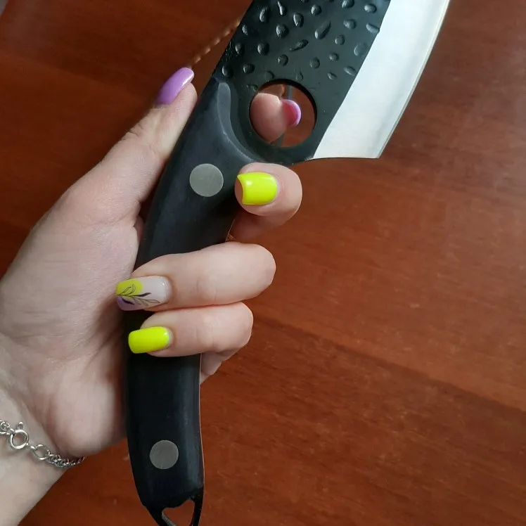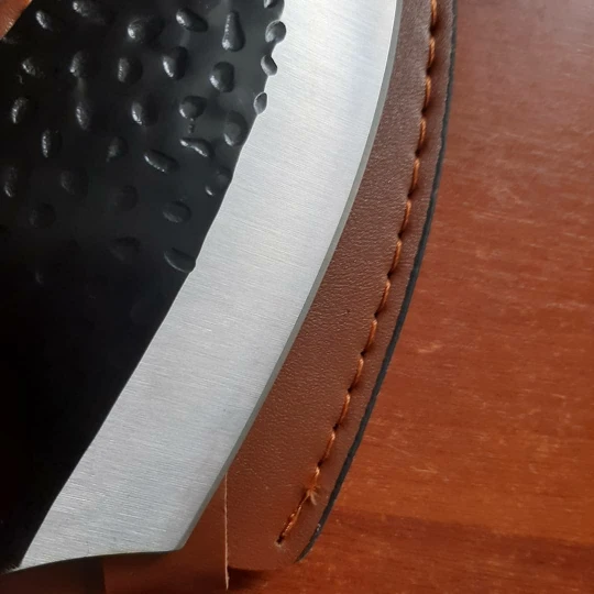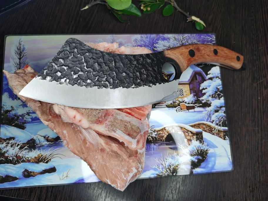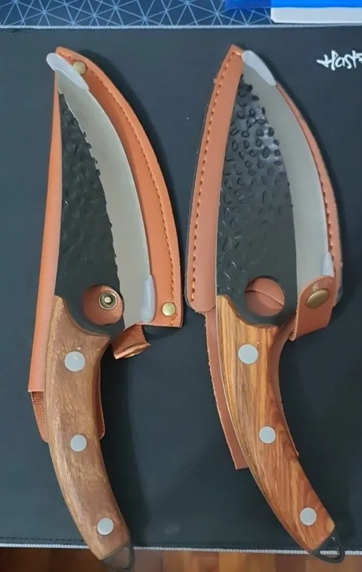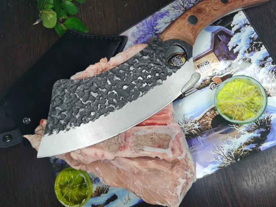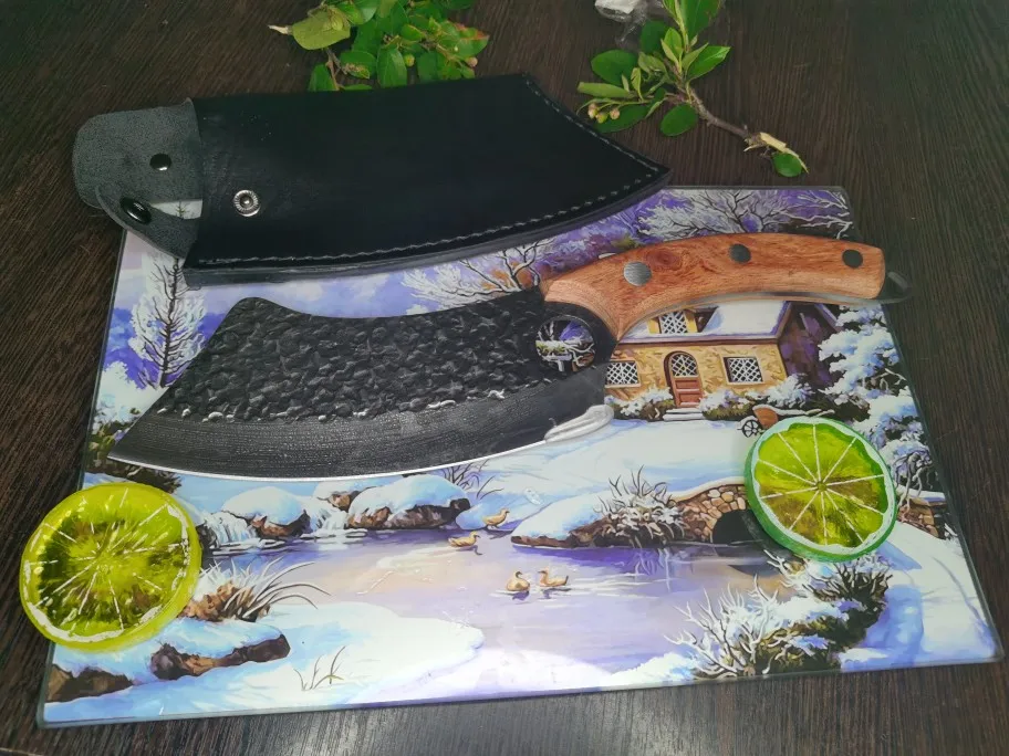 Кованый кухонный нож для мяса, птицы и рыбы с кожаными ножнами. На странице продавца множество вариантов, с ножнами и без, разных цветов, форм.. Я выбрала с чехлом, так нож удобно брать на природу. У меня по плану были сосиски из куриного филе, решила сразу и испытать нож. Измельчает отлично даже подмороженое филе. В руке удобен, но я не сразу начала фиксировать палец в специальном отверстии. Оно нужно, мне кажется, когда мясо жёсткое, и нужно найти точку опоры. Качество отличное, заточен нож идеально, что еще нужно? Рекомендую однозначно!