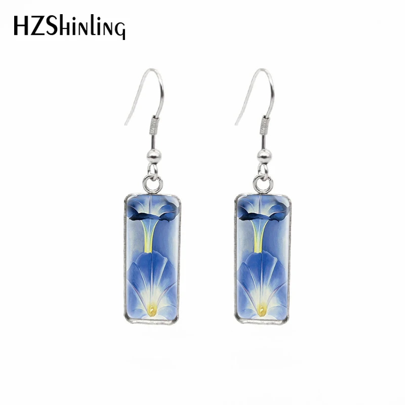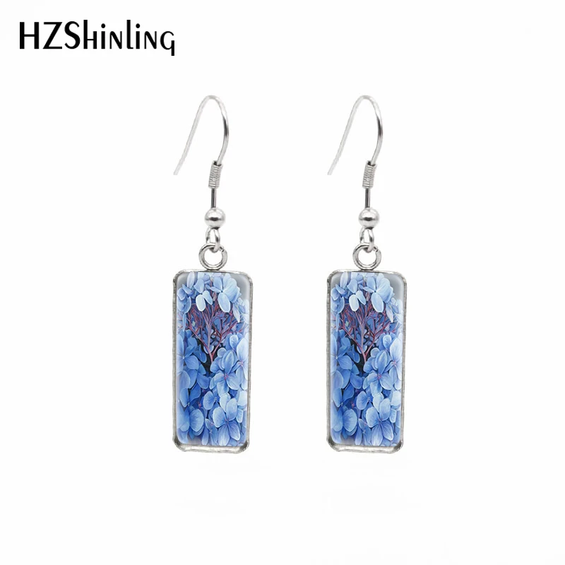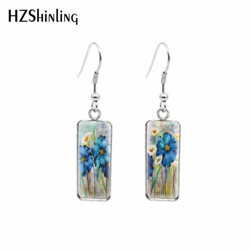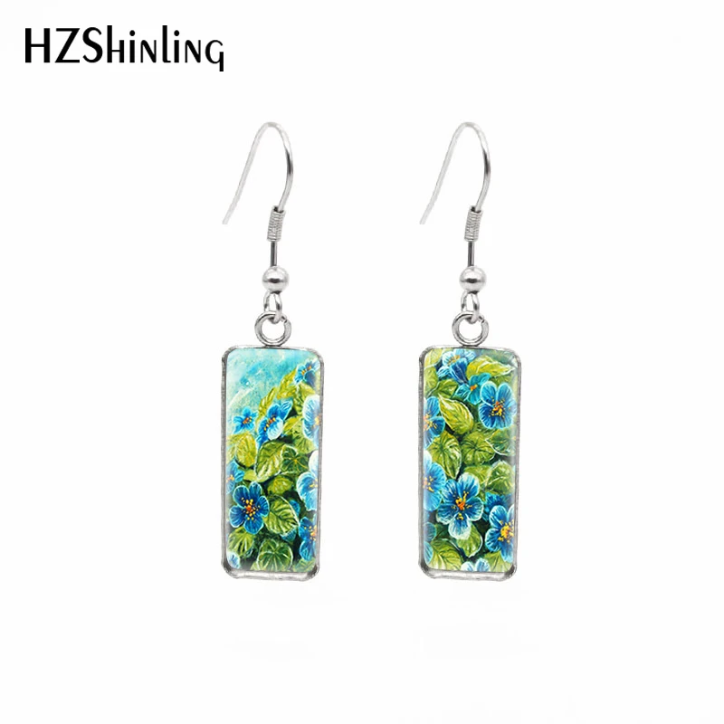 Серьги-крючки, с натуральными синими цветами, прямоугольные, с цветочной росписью, стеклянные, с кабошоном, ювелирные изделия ручной работы, 2021