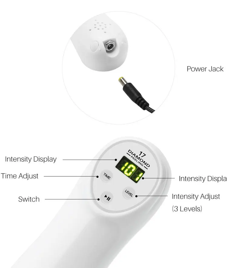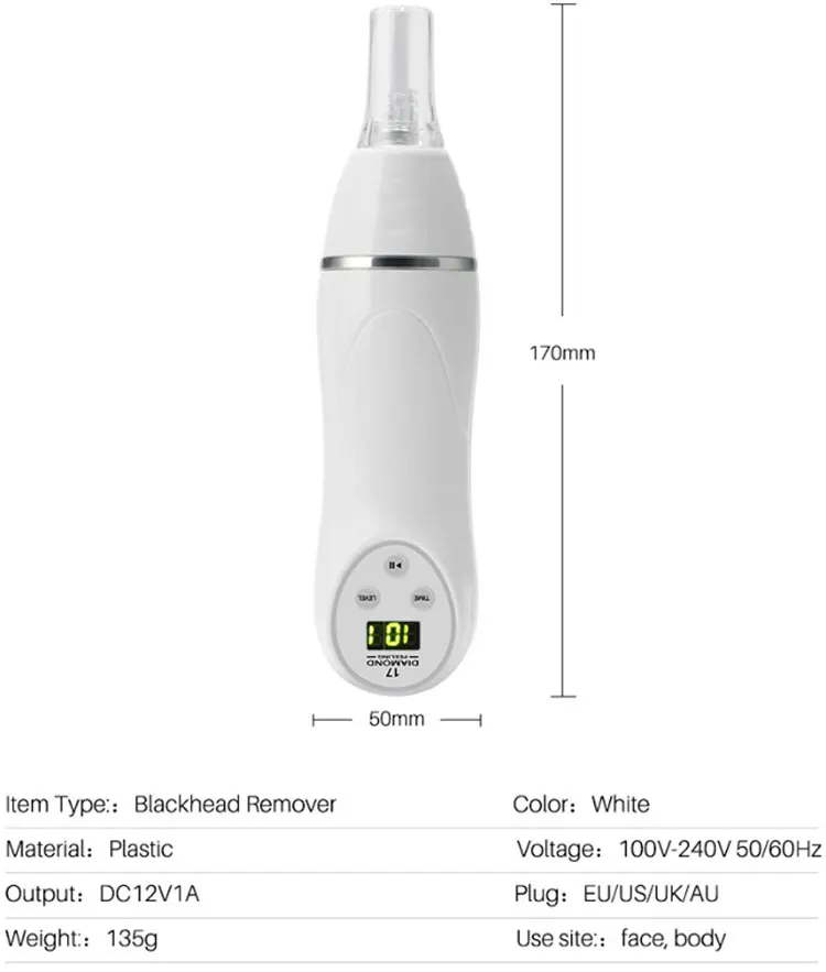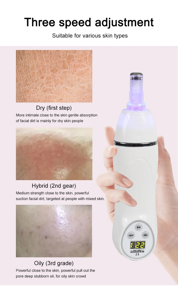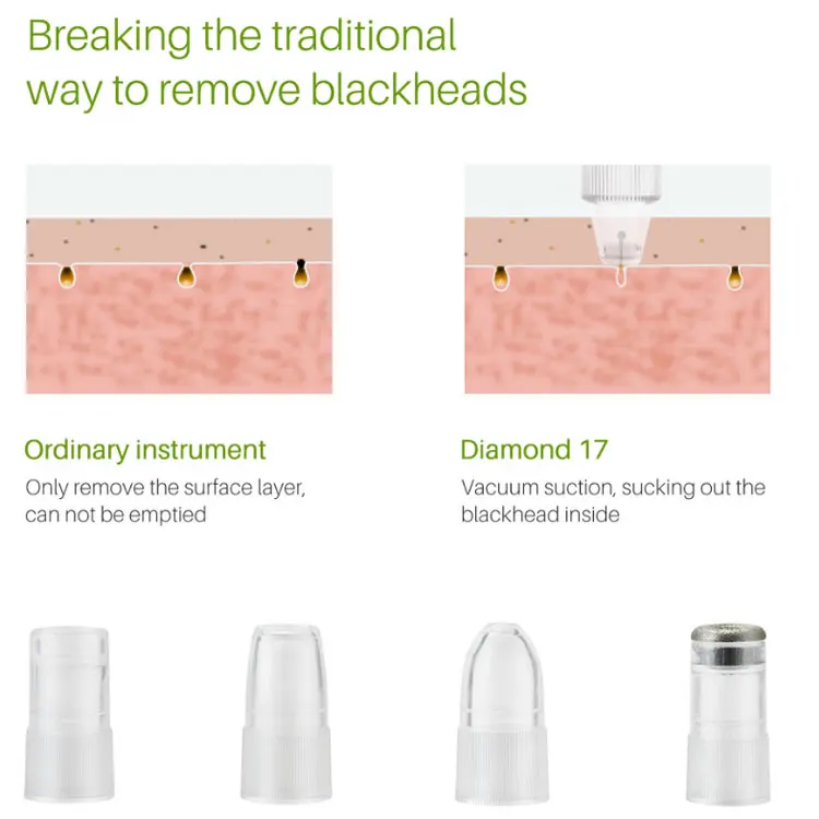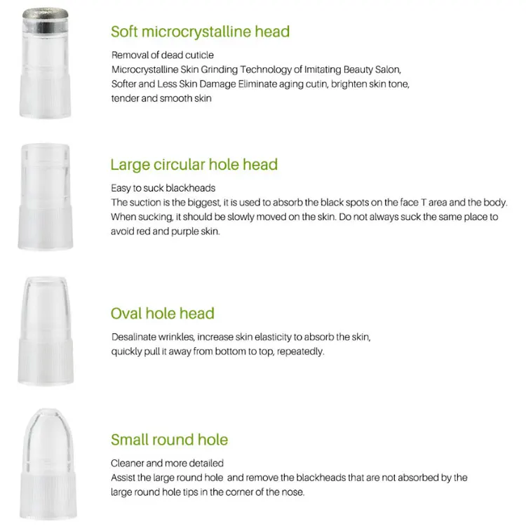Алмазная головка: может отшелушивать омертвевшую кожу и высасывать ее, восстанавливая кожу, удаляя морщины и акне. Большое круглое отверстие: Мощное всасывание черных точек, нанесите против черных точек на нос и V-образное лицо. (Используйте с экстрактом черных точек и водой, сужающей поры) маленькое круглое отверстие: слабое всасывание, его можно использовать для всасывания черных точек, подходит для тонкой и тонкой кожи. Овальное отверстие: устраняет морщины. После всасывания кожи быстро отсоедините, а затем снова высасывайте. Стимулирует кровообращение, повышает эластичность кожи, эффективно устраняет морщины.