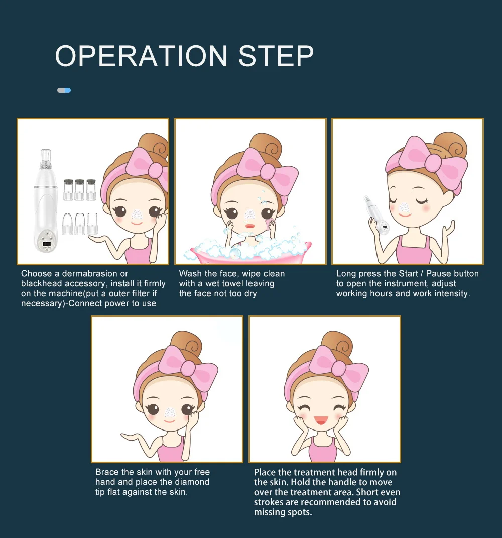 1. Полностью очистите лицо. 2. Горячее полотенце для лица и пор вашей кожи уменьшит давление при использовании этого устройства. 3. Высушите воду чистым полотенцем или салфетками для лица. 4. Лучше будет работать с жидкостью, полученной от угрей. 5. Нажмите ON/OFF, чтобы включить машину, установите скорость (Уровень 1-3). 6. Работайте рядом с кожей. 7. Вымойте кожу теплой водой (Не используйте очищающее средство для лица), сушите поры и увлажните лицо. 8. Очистите аппарат для очистки алмазной кожи.
