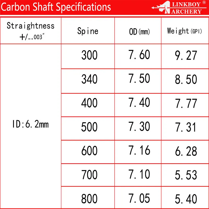 Описание: 1) Прямолинейность: +/- .003" 2) Длина: 30''32 ''свободный крой 3) позвоночника: 300/340/400(30 дюймов) 300/340/400/500/600/700/800(32 дюйма) 4) Цвет: желтый 5)ID: 6,2 мм 6) в посылка: 12 комплектов (стрелочный Вал + 100гр точка + вставка)