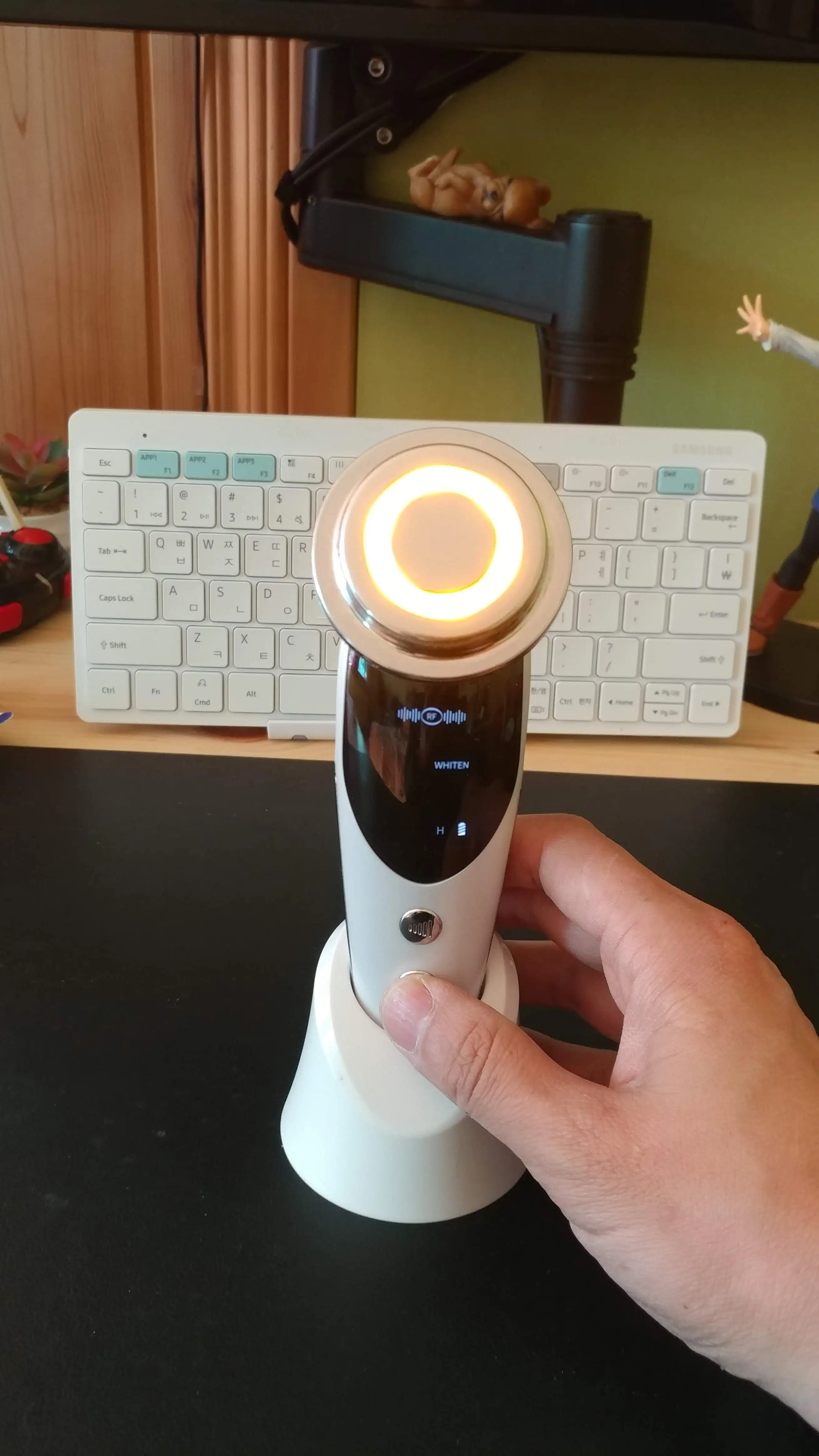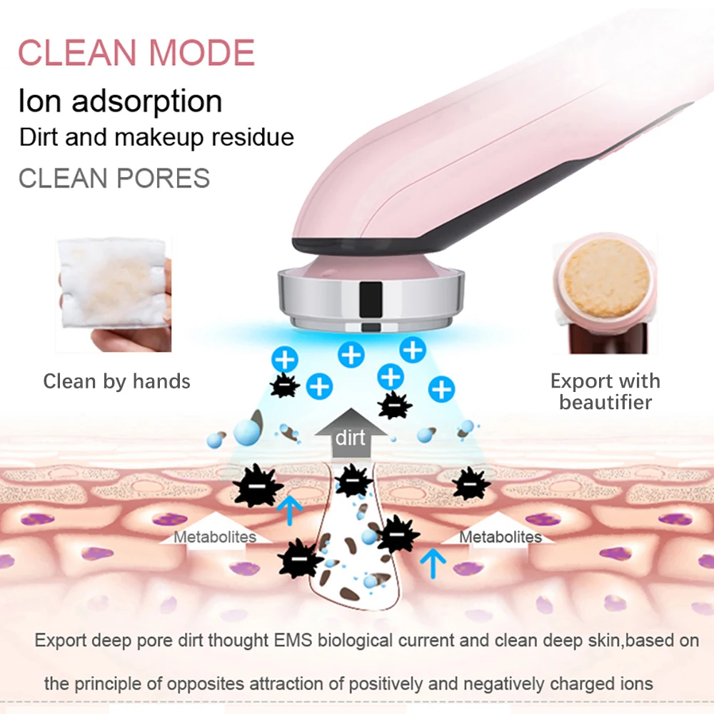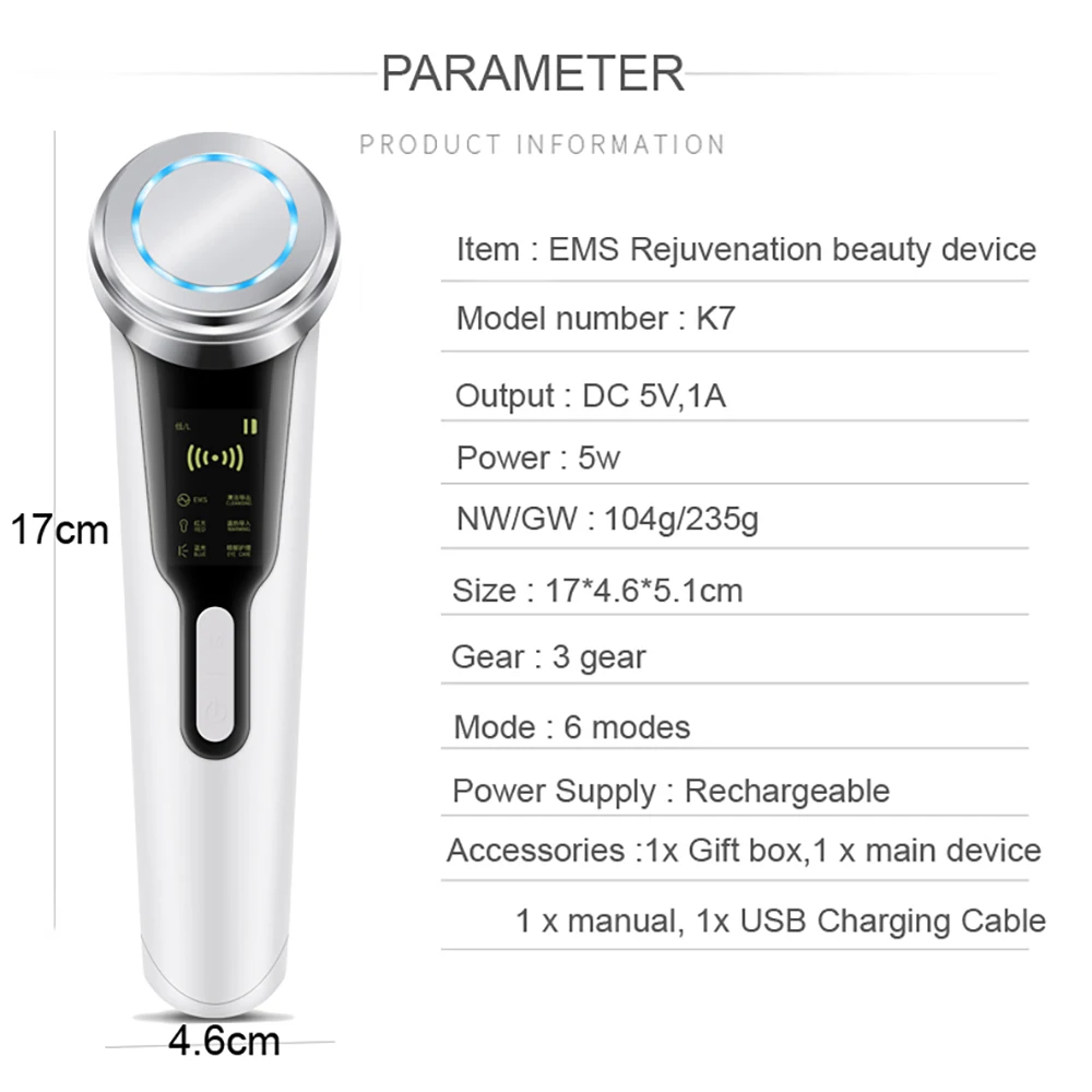 Это устройство для красоты лица с EMS микротоками (гальваническими ионами), теплыми вибрациямиМассажный, красный, синий и оранжевый свет, способный реализовать глубокое очищение, лучшее омоложение и лифтинг лица.* EMS микроток (гальванические ионы): Используйте принцип наиболее мягкого импульсного тока анода и катода привлекают, смягчают и разряжают жир и грим.* Вибрация принимает физический вибрирующий, электрический стимулирующий способ для повышения эластичности и усиления клеточного метаболизма.* Теплый массаж способствует усвоению средств по уходу за кожей, делает текстуру кожи растянутой, сохраняет кожу полной эластичностью.* Красный светильник: 640нм-650 нм красный светильник глубоко в дерму, увеличивает кровообращение, уменьшает морщины, подтягивает кожу и стимулирует производство новых клеток кожи.* Длина волны голусветильник 415нм оказывает быстрое противовоспалительное действие, снижая жирность кожного сала устраняют бактерии акне для удаления акне и мочалки, улучшают жирность кожи.* Оранжевый светильник: длина волны 600 Нм глубоко в кожу 1-2 мм, эффективно лечит красные пятна кожи Снимает отеки, способствует обмену кутикулы, чтобы сделать кожу отбеливающей.