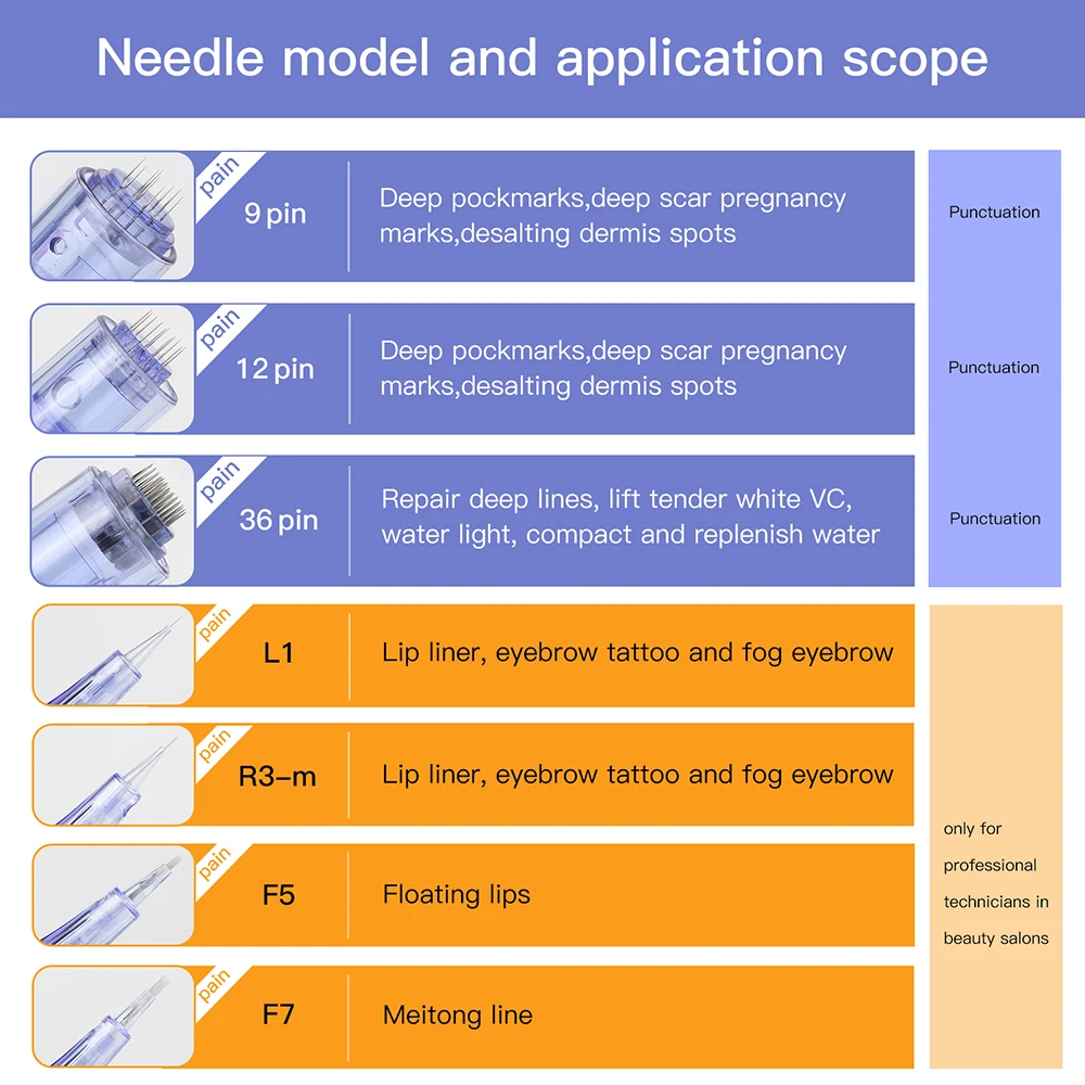 Кол-во: 10/50/30 шт. Картридж: 9 pin / 12 pin / 36 pin /24pin/ 42 pin/ nano иглы (подходит для Dr Pen A6). Тип ручки Dr: байонетный порт. Dr. Pen: не включайте его. Если вам нужен Dr.pen A6, он доступен, вы можете связаться с нами, чтобы купить!