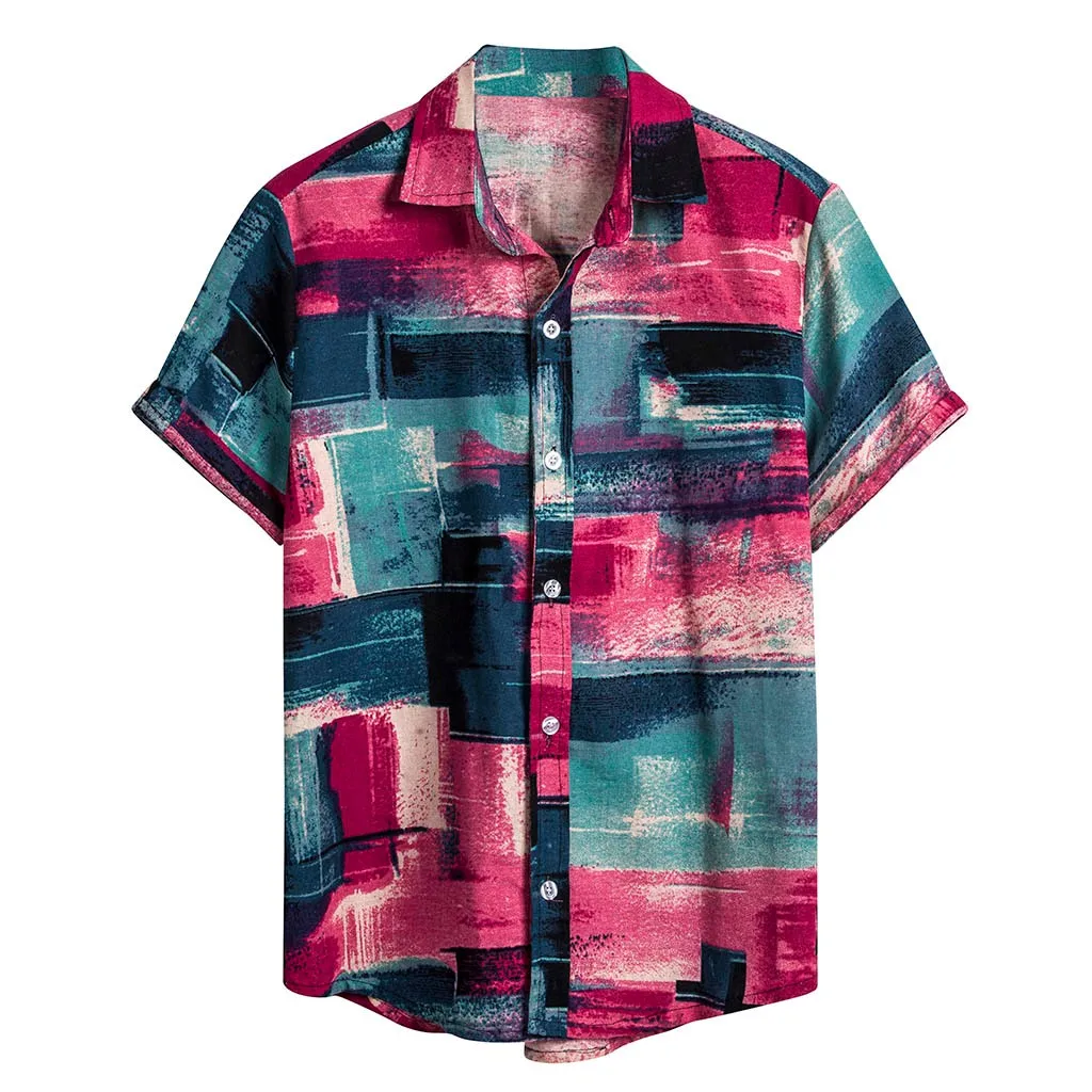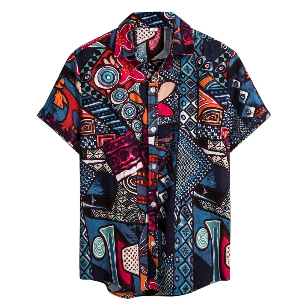 Мужские этнические рубашки с коротким рукавом, хлопковая, льняная Повседневная рубашка, гавайская блузка с принтом, винтажная блузка с воротником-стойкой для отпуска