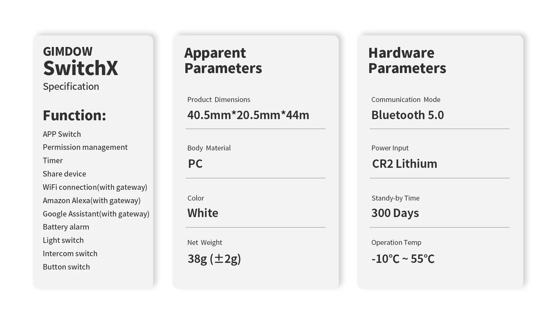 Люди могут делиться временными виртуальными ключами с людьми, которым они доверяют (например, сидящими домашними животными, членами семьи, друзьями и гостями Airbnb).Параметры изделия GIMDOW A1 (замок)Видимые параметрыРазмеры изделия: 135 мм x 60 мм x 45 ммМатериал корпуса: поликарбонат и стальЦвет: серая сеткаВес: 286 гПараметры оборудованияРежим связи: выше Bluetooth 4,0Дата батареи: батарейка АА * 4Выносливость: 300 днейПоддержка приложенияAndroid: более 5,0IOS: более 8,0Параметры изделия GIMDOW P1 (блокировка паролем)Видимые параметрыРазмеры изделия: 80 мм x 80 мм x 25 ммМатериал корпуса: алюминиевый сплав и поликарбонатЦвет: серыйВес нетто: 90 гПараметры оборудованияРежим связи: выше Bluetooth 4,0Дата работы батареи: батарейка АА * 2 Срок службы: 300 днейПоддержка приложений Android: более 5,0IOS: более 8,0