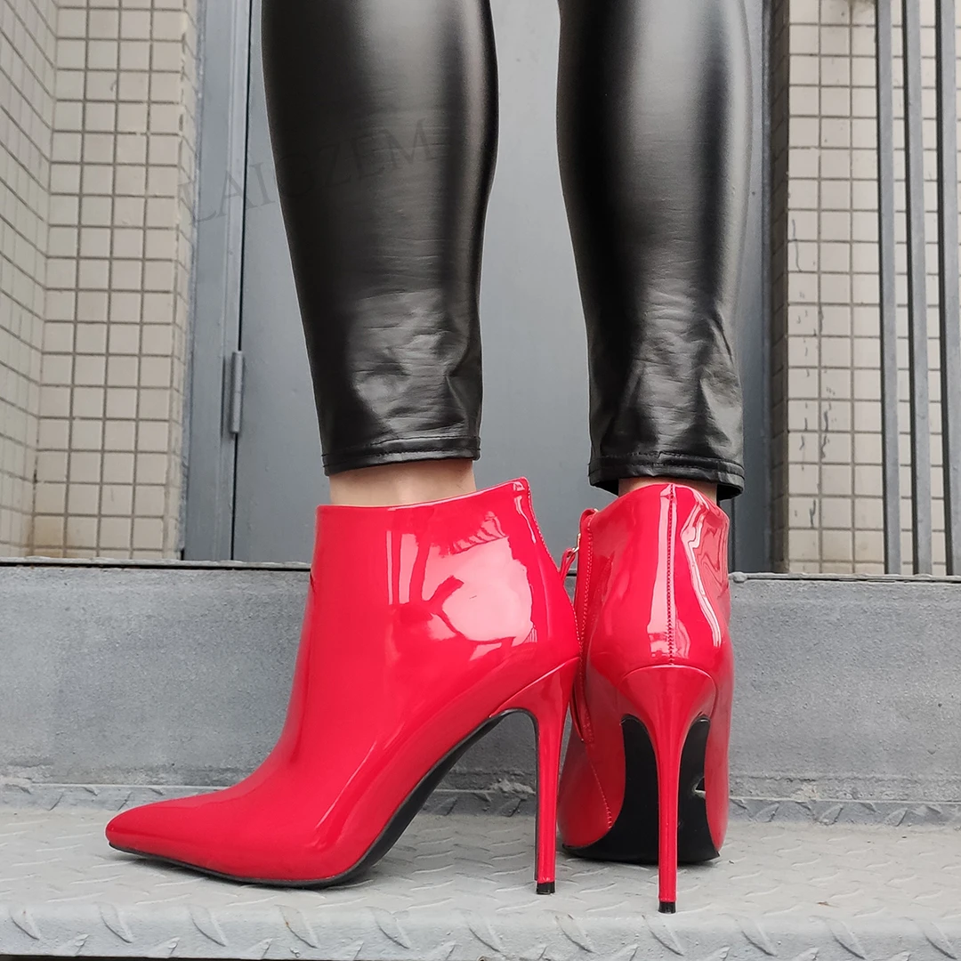 LAIGZEM/женские ботильоны с молнией сбоку; Блестящие полусапожки на высоком каблуке-шпильке; 4 сезона; Женская обувь; Zapatos Mujer; Размеры 41, 44, 47