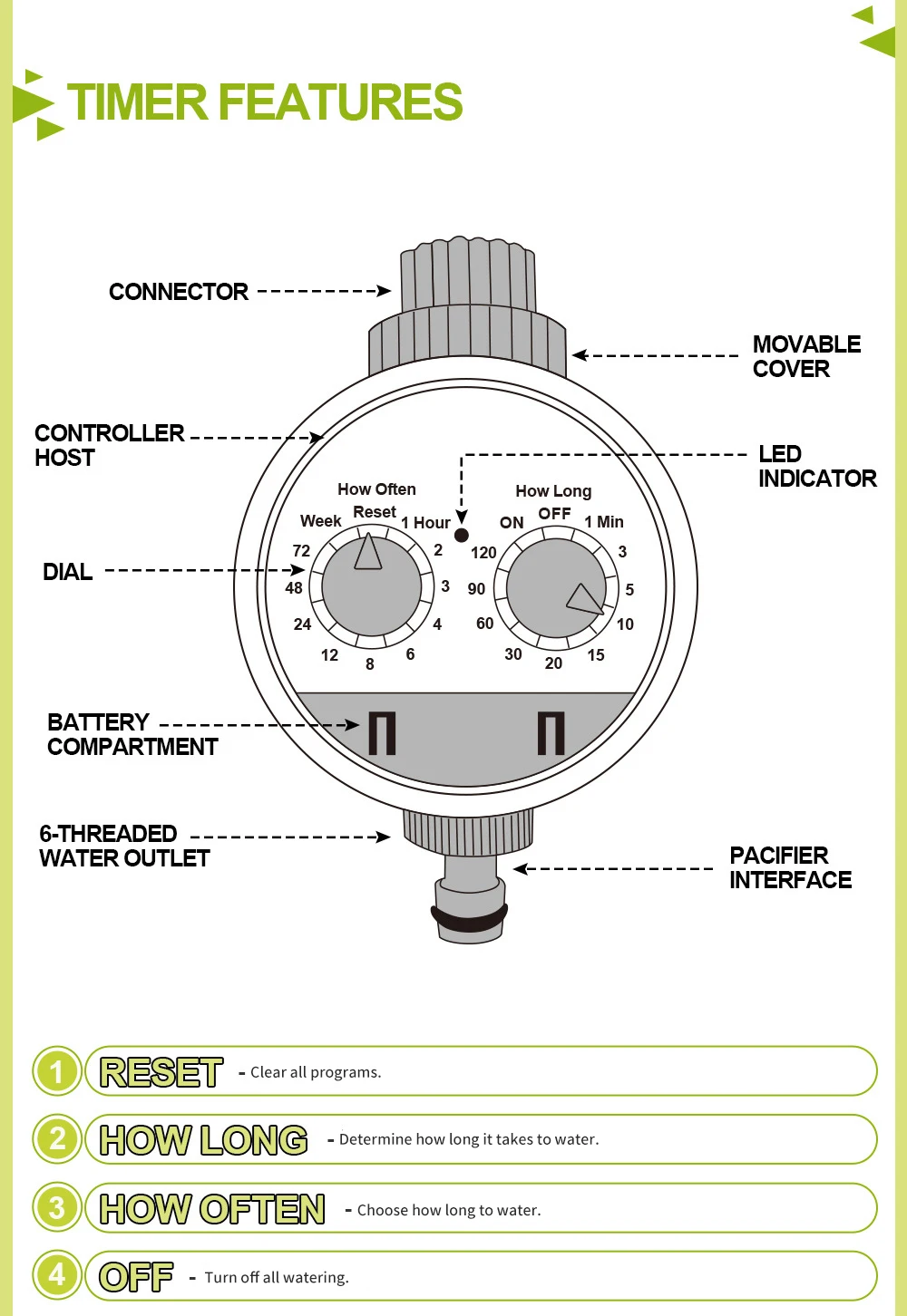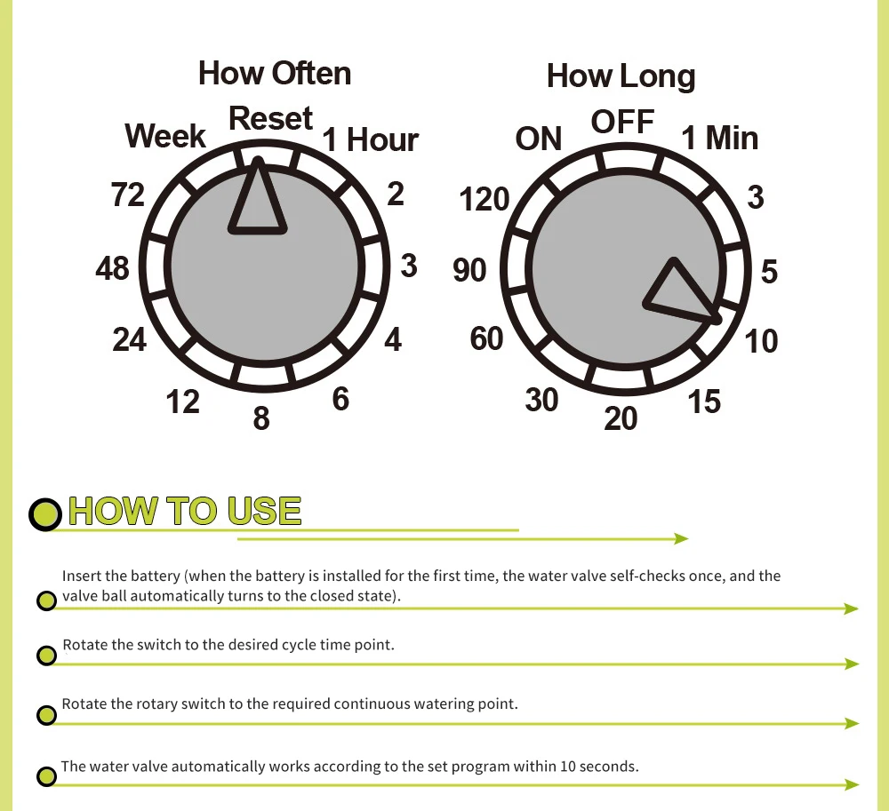 Как использовать1. Установите батарею.2. Подключите кран.3. Вы можете поворачивать кнопку на "как часто", что вы можете установить, как часто вы хотите поливать свои растения.4. Поверните кнопку на "как долго" и вы сможете задать время для полива растений.
