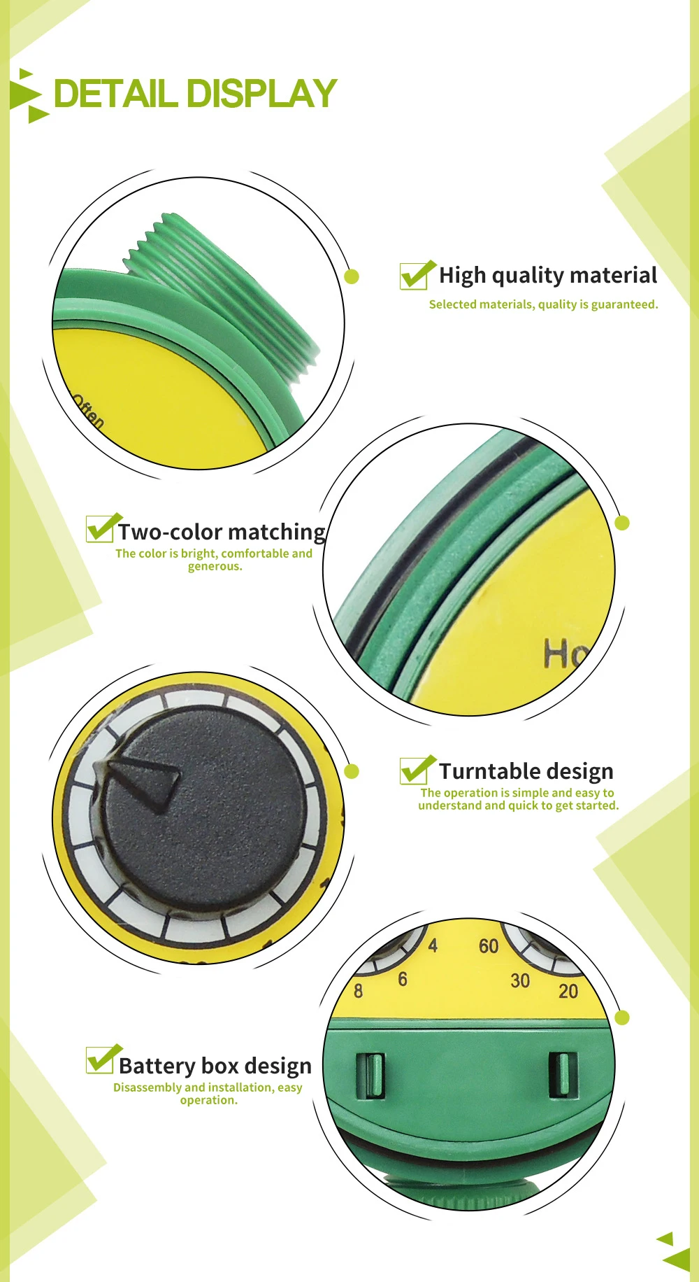 Особенности:Высококачественный АБС-пластик, прочный, уплотнения плотно спроектированы для предотвращения протечек, уплотнений, износа и коррозии.С помощью Автоматического Программируемого времени полива вы можете установить время полива сада, когда вас нет дома.Время полива (можно контролировать поворотным переключателем), непрерывный выход в указанном порядке, самое короткое время открытия клапана полива составляет 1 минуту, а самое длинное время непрерывного открытия полива клапана-120 минут.Цикл полива (управляется поворотным переключателем), минимальное время цикла составляет 1 час, а самое длинное время цикла-72 часа.Таймер экономии воды экономит воду и время, эффективно использует водные ресурсы и повышает эффективность автоматического орошения. Можно использовать в садах, сельском хозяйстве, овощах, зеленых лесах и т. д.