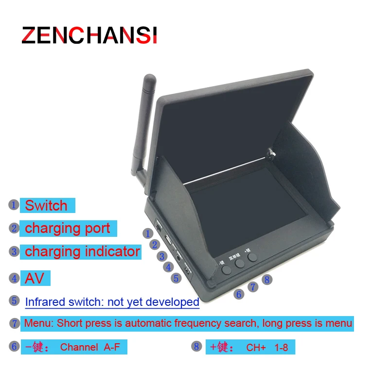 Экран Размер: 4,3 дюйм (ов)Разрешение: 480x272 пикселейСоотношение сторон: 16:9Яркость: 350cd/m2Формат видео: NTSC / PALВыход AV: выходной видеоинтерфейс 3.5AVРабочее напряжение: 5 ВЗарядка: Стандартный Micro_USB 5V/2AДисплей интерфейса: приемный канал и частота, мощность аккумулятора, сила сигналаВстроенный аккумулятор: 1800 мАч (1S)Время работы: >2 часаЧувствительность: -90dBmРазъем антенны: RP-SMA (внутренний штифт)Размер: 123*85*26 ммЧастотный диапазон: 5362 МГц-5945 МГцКанал: канал 48С функцией автоматического поиска частоты параметры цвета и яркости экрана дисплея регулируются.