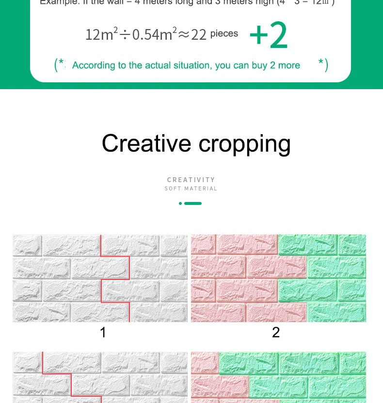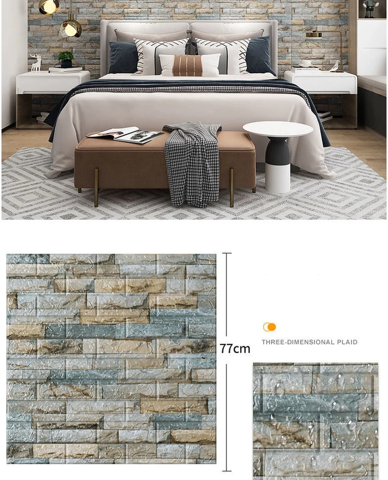 Особенность:1: трехмерная декоративная мягкая пена, предотвращение столкновений для детей, забота о вашей семье в безопасности.2: Безопасность и защита окружающей среды, не токсичен без запаха, подходит для семейного безопасного домашнего пространства.3: Реалистичный, эффект естественного узора кирпича, простой и современный стиль.4: Бесплатный самоклеящийся дизайн, установка, случайный коллаж, произвольный разрез.5: сравнение обоев улучшает эффект шумоподавления.Способы и инструменты установкиПодготовка: приклейте поверхность чистой с адгезией, такой как: деревянная поверхность, стеклянная поверхность, без пыли стены, ударите по дну стены шпатлевкой и так далее.
