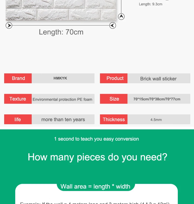 Размер изделия:10 шт. 70 см * 15 см, может покрыть 1,05 квадратных метров стены