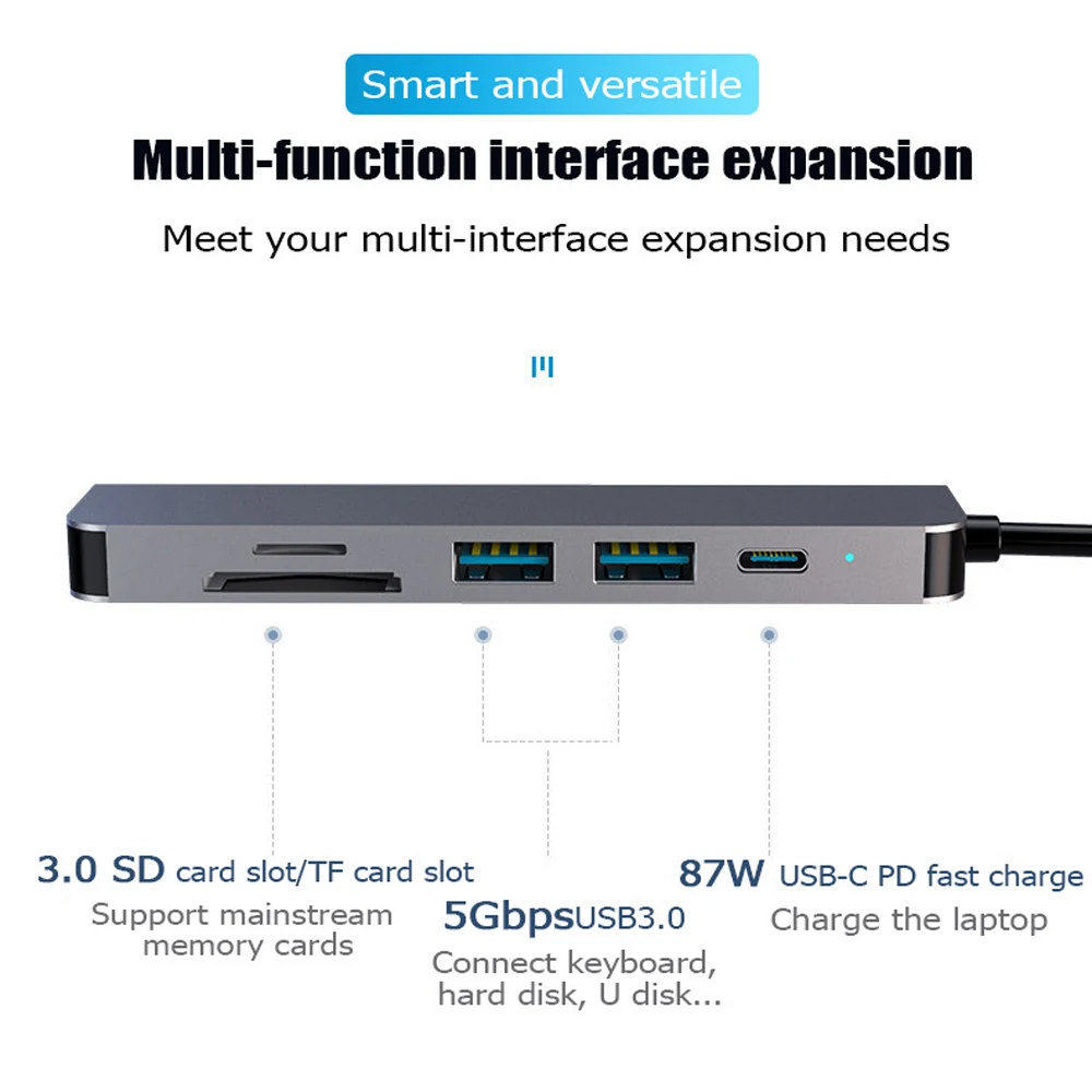 В наличии 3 модели, пожалуйста, выберите подходящую модель в соответствии с вашими потребностями:1) 6 в 1 Модель: PD * 1 + HDMI-совместимость * 1 + USB 3,0*1 + USB 2,0*1 + TF * 1 + SD * 12) 6 в 1 B модель: HDMI-совместимость * 1 + USB 3,0*1 + USB 2,0*2 + TF * 1 + SD * 13) 4 в 1 Модель: PD * 1 + HDMI-совместимость * 1 + USB 3,0*1 + USB 2,0*1