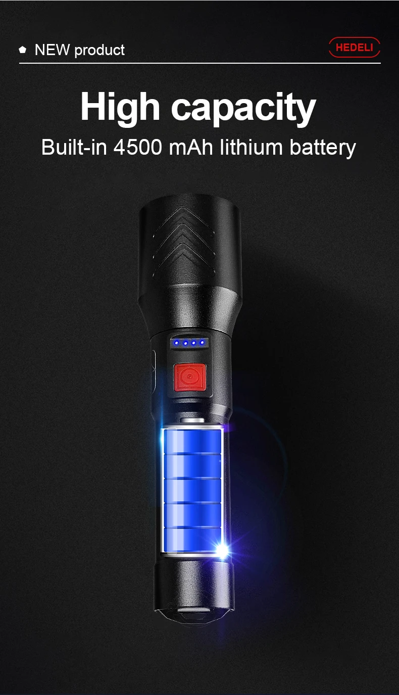 СветодиодныйПараметры продуктаБренд: HEDELIСветодиодный излучатель: светодиодныйРежим: 5 режимов (100% - 25% - flash-S0S)Тип батареи:Встроенный аккумулятор 3000 мАчАккумулятор большой емкостиВремя освещения: 3-5 часов.Цвет: черныйРежим переключения: кнопочный переключатель,Объектив: выпуклая линзаМатериал корпуса: авиационный алюминиевый сплавРазмер: 8*2*1,5 смРежим масштабирования: телескопический зумУровень водонепроницаемости: IPX-4Диапазон: 250-400 мSuitable подходит для работы, охоты, альпинизма, рыбалки, кемпинга и активного отдыха и т. д.