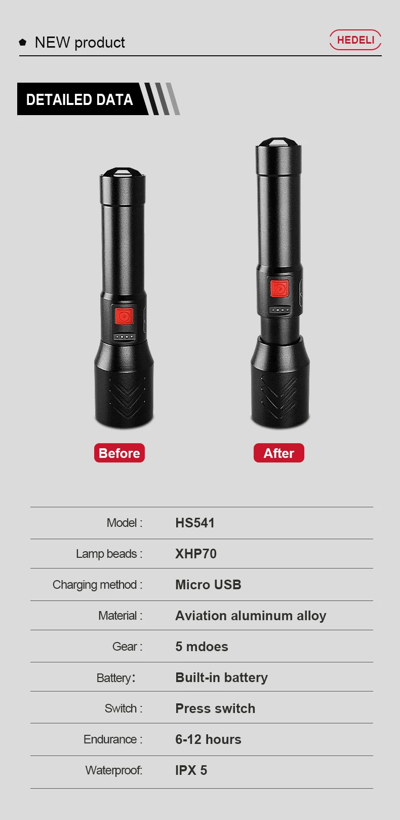 Бренд: HEDELIСветодиодный излучатель: XHP70Режим: 5 режимов (100% - 25% - flash-S0S) , длительное нажатие, чтобы выключить светильникТип батареи:Встроенный 4500 мАчАккумулятор большой емкостиВремя освещения: 6-12 часов.Цвет: черныйРежим переключения: кнопочный переключатель,Объектив: выпуклая линзаМатериал корпуса: авиационный алюминиевый сплавРазмер: 16,5*4*2,8 смРежим масштабирования: телескопический зумУровень водонепроницаемости: IPX-5Диапазон: 450-600 мSuitable подходит для работы, охоты, альпинизма, рыбалки, кемпинга и активного отдыха и т. д.