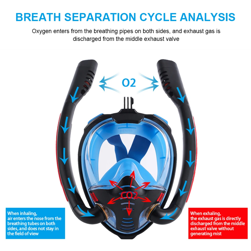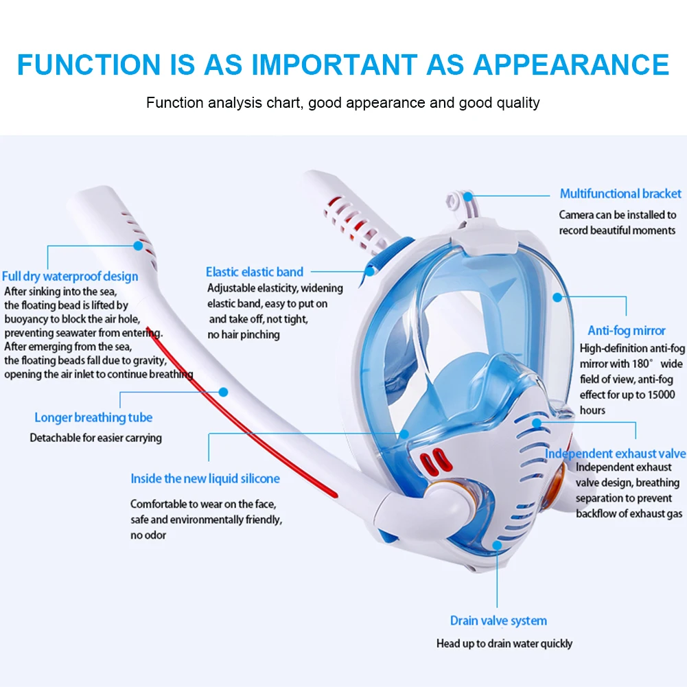 * 3. 180 ° панорамный вид-Ультра-широкая маска изготовлена из 100% ПК, которая является сильной и небьющейся, обеспечивая широкое поле обзора 180 °, жидкая силиконовая подкладка безопасна и удобна в носке и плотно прилегает к лицу, чтобы предотвратить просачивание воды