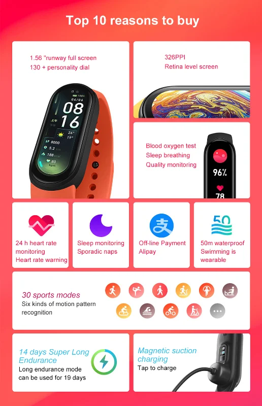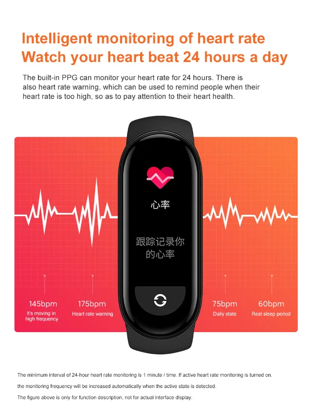 Мониторинг здоровья: оксиметр: полное представление о ваш собственный здоровья; Поддержка оксиметр насыщения кислородом SpO2 проверьте, чтобы понять ваше тело лучше сердечный ритм: smart 24 часа сердечный ритм Мониторинг, активные напоминания о ненормальных импульсах, управление женским циклом и напоминания: запись менструального периода, браслет перед вибрацией напоминает вам готовиться заранее и быть более Спокойный