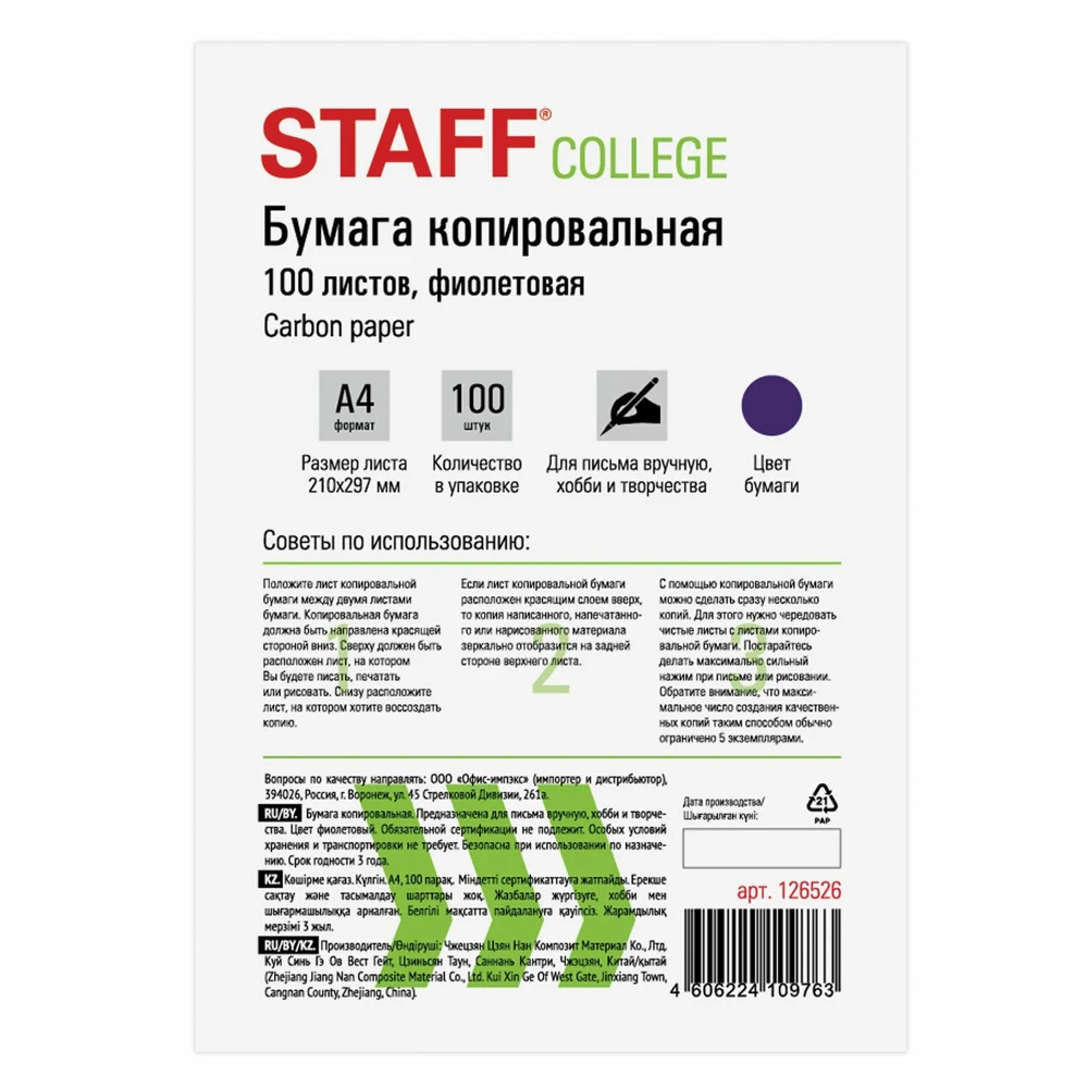 Имеет стандартный формат А4 и односторонний фиолетовый красящий слой. Не пачкается. Может использоваться многократно. 100 штук в упаковке хватит на долгое время. Творите с радостью вместе с копировальной бумагой STAFF! Оформление заказа займет считанные секунды! Копировальная бумага STAFF предназначена для письма вручную, хобби и творчества.