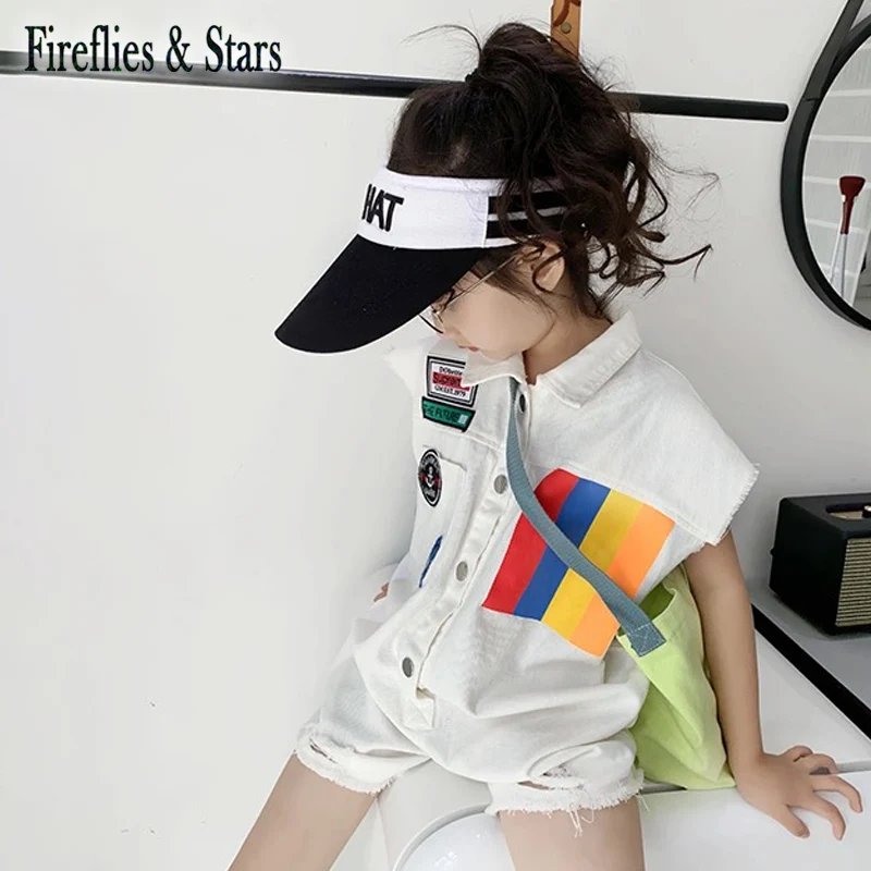 Имя:Летний джинсовый комбинезон для девочек, детский цельнокроеный комбинезон, Детская уличная одежда с коротким рукавом, бандажные рваные Комбинезоны на возраст от 4 до 12 лет