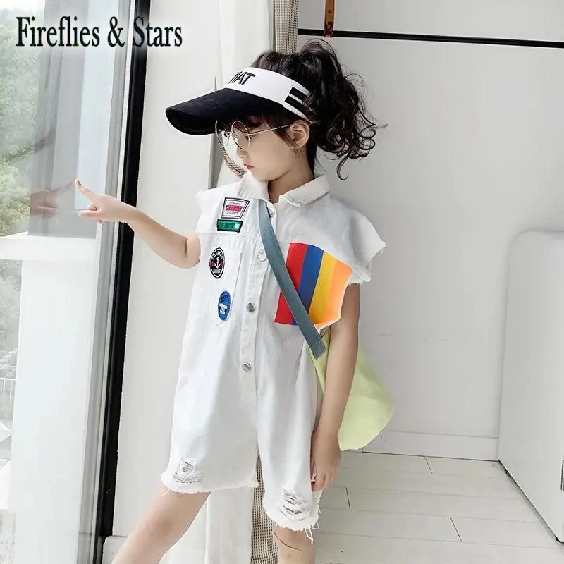 Летний джинсовый комбинезон для девочек, детский комбинезон, Детская уличная одежда, короткий рукав, бандаж, рваные, от 4 до 12 лет