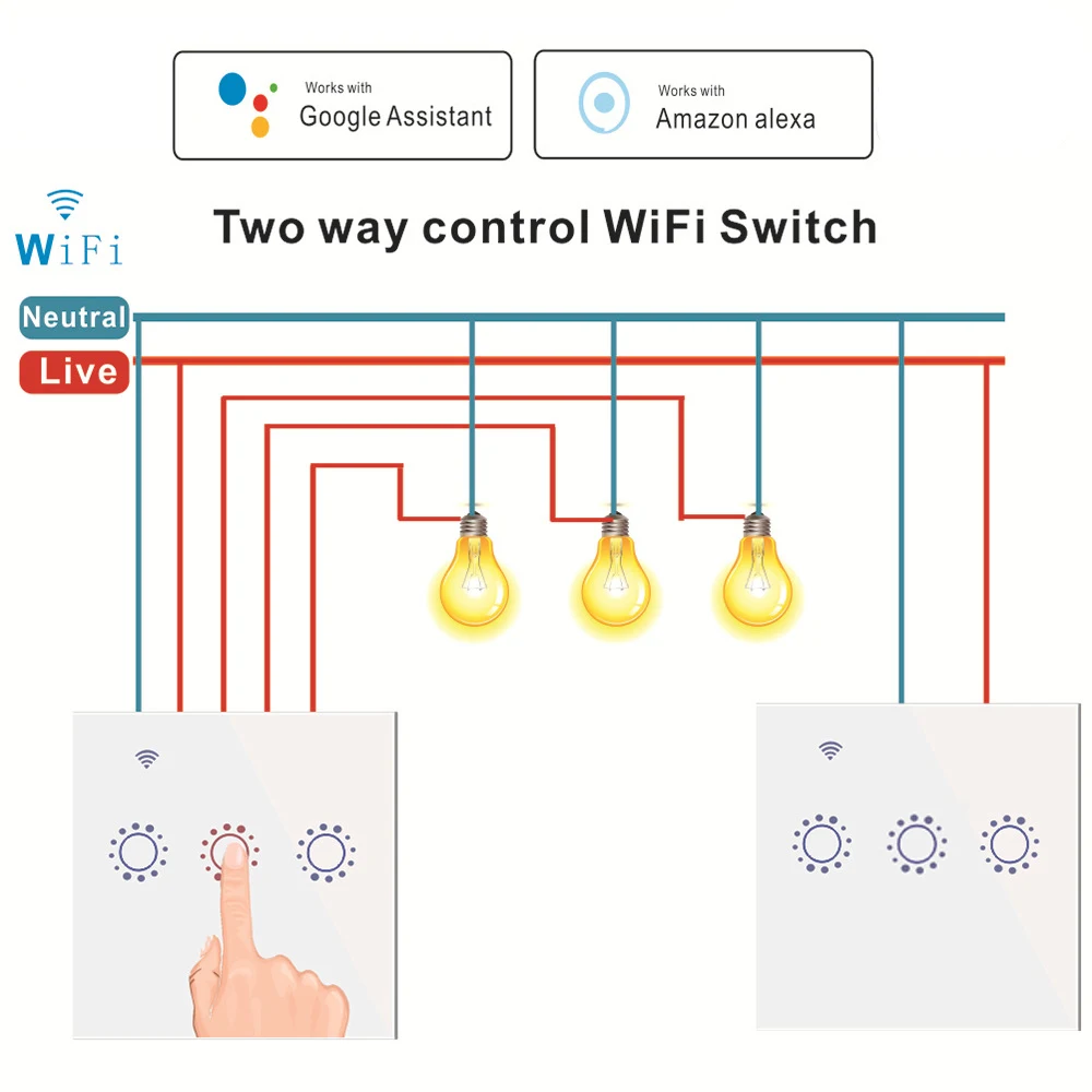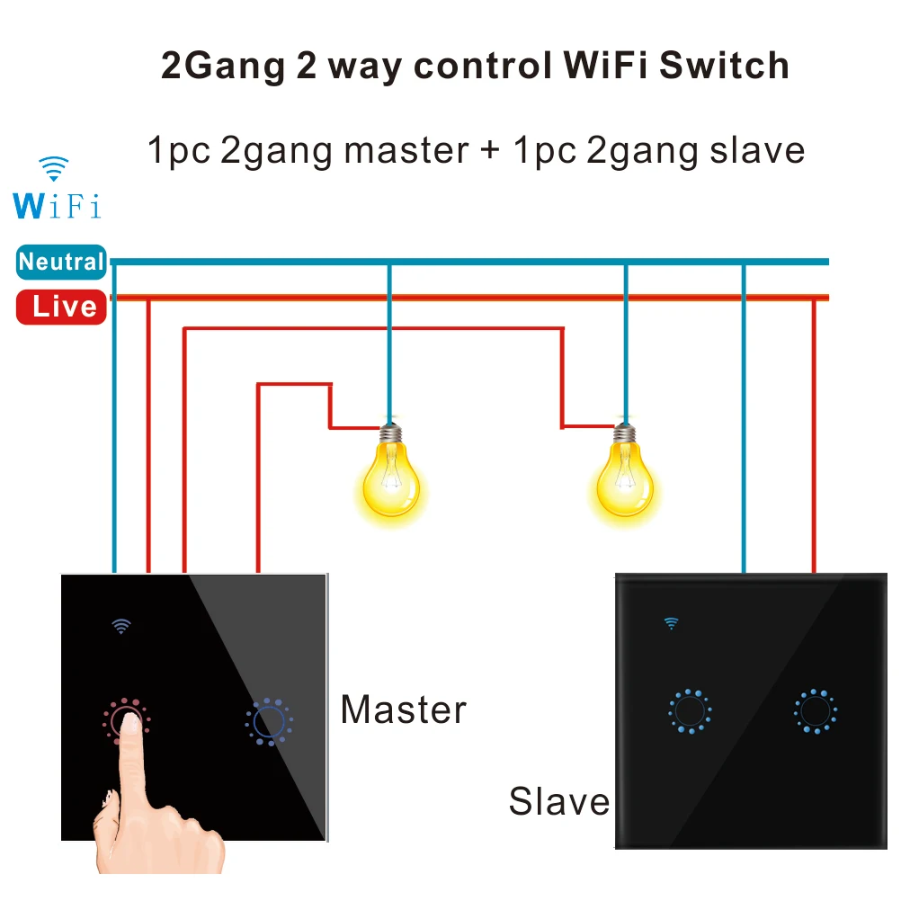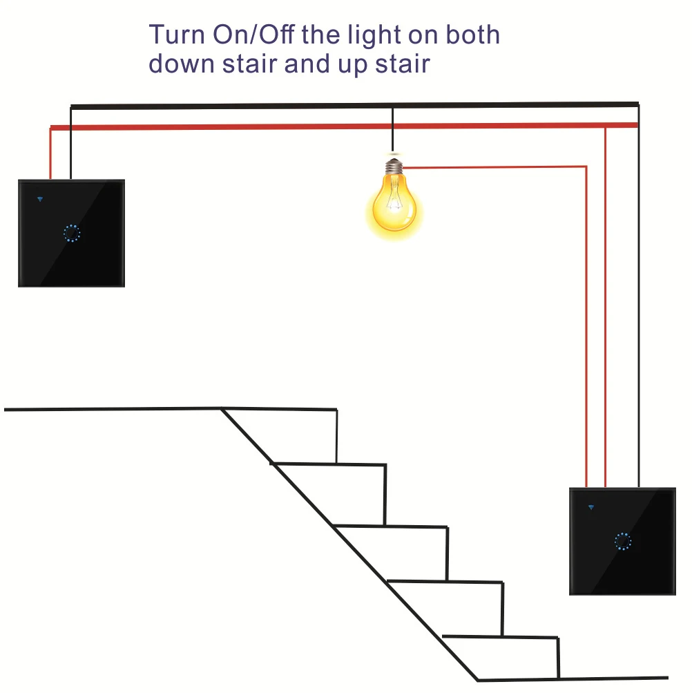 Двойной пульт дистанционного управления WiFi smart touch, два переключателя, установленные в разных положениях, могут осуществлять синхронное управление одним и тем же светильник. Он в основном используется между вверх и вниз лестницами. Он может действительно включить светильник, прежде чем идти вверх и выключить светильник наверху; переключатель входа в комнату и прикроватный выключатель могут осуществлять двустороннее Управление включением светильник при входе в комнату и выключении светильник на кровати.