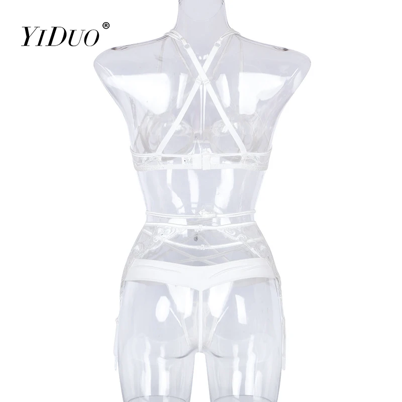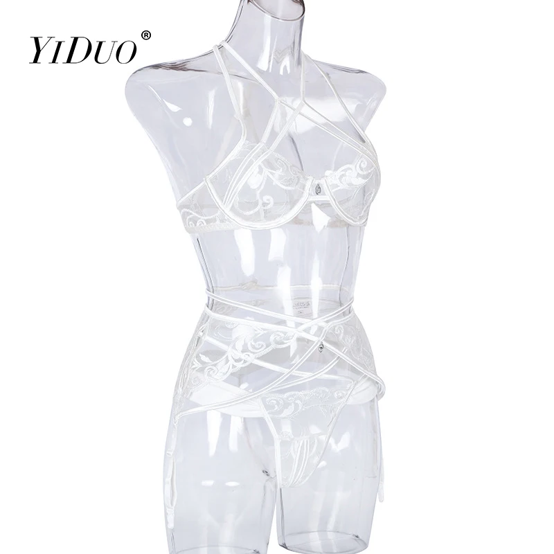 YiDuo белая Цветочная вышивка сексуальное кружевное Сетчатое женское комплект Для женщин вечерние прозрачные подвязки бюстгальтер на косточках повязки нижнее белье 2021