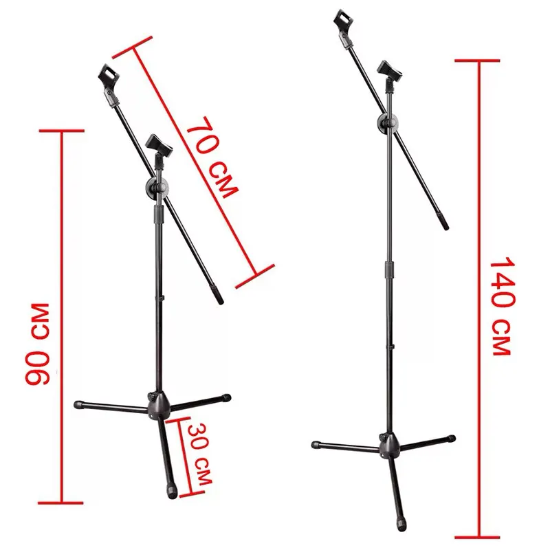 Телескопическая микрофонная стойка-журавль на треноге - практичная стойка для сценических и вокальных микрофонов, можно использовать в студии звукозаписи. Стойка имеет складную конструкцию с дополнительной стрелой (плечом) длина которой равна 70 см. Стрела закреплена на треножной стойке-штативе с регулируемой высотой. Высота микрофонной стойки может изменяться в пределах от 80 см до 140 см, в зависимости от требований музыкантов и исполнителей.