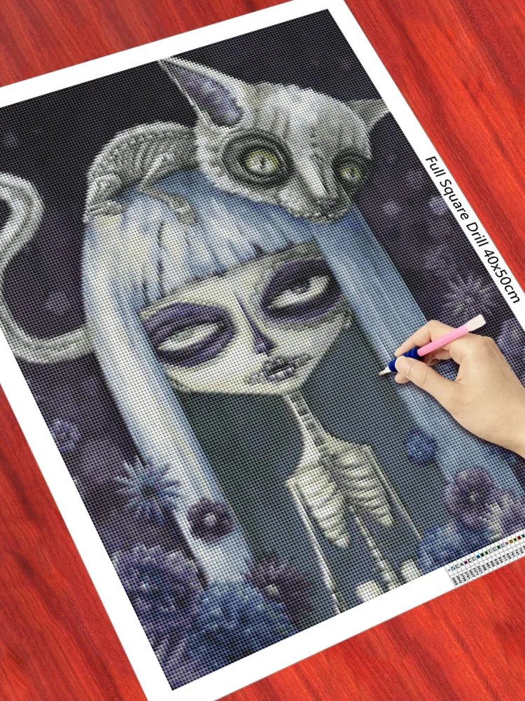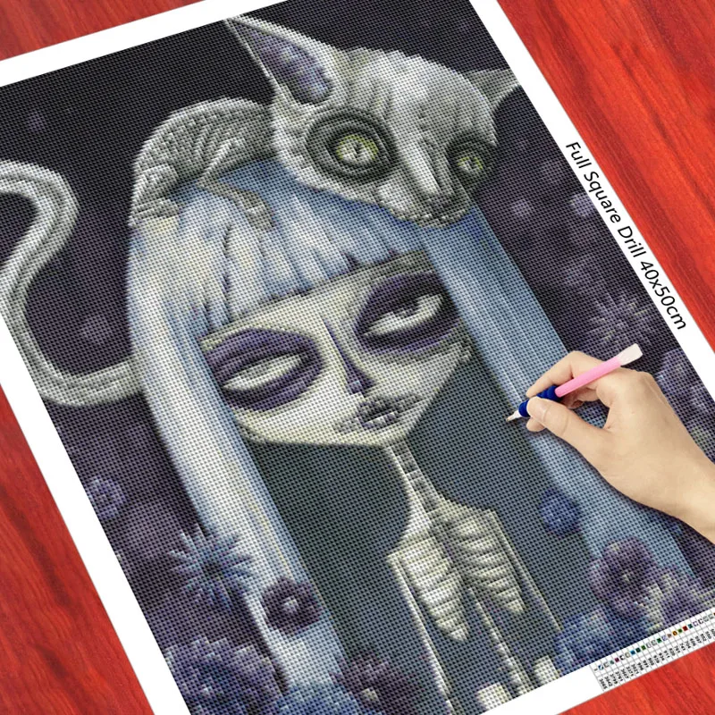 Новая алмазная живопись, мультяшная девушка, красота, Череп, волк, кот 5D, полная выкладка, вышивка крестиком, 3D круглая мозаика, рисование 068
