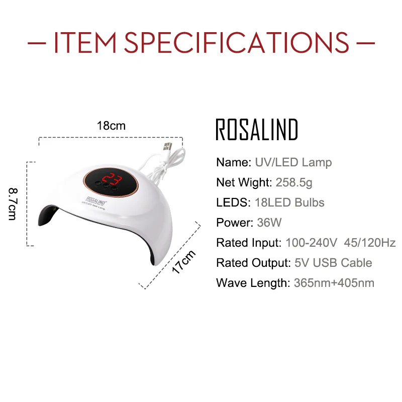 Характеристики Товара:Бренд: ROSALINDНазвание: УФ/Светодиодная лампаВес: 258,5 гСветодиоды: 18 светодиодных лампМощность: 36 ВтНоминальная Вход: 100-240V 45/120 ГцНоминальный выход: 5 В USB кабельДлина волны: 365нм + 405нмПосылка:1. Светодиодный/УФ-лампа для ногтей2. Зарядное устройство USB3. Коробка для посылка4. Руководство пользователяШаг за шагом:1. Подключите usb-кабель.2. Нажмите на режим синхронизации, который вам нужен, 30s, 60s или 90s.3. Инфракрасные датчики активируют лампу сразу же, когда вы вставляете руку.4. Подождите несколько минут, и он высохнет.5. Лампа будет выключена, когда вы вытащите руку.1. Почему гель для ногтей не высыхает светодиодный/УФ-лампа для ногтей?После того, как лампа для полировки ногтей излечивается слоем плавающего геля, это нормальное явление, а не сухость. Не трогайте вручную, вы можете использовать моющее средство или спирт для удаления плавающего геля. Нанесите верхнее пальто и закрепите его. Закончите.2. Почему не высокая температура светодиодный/УФ лампа для ногтей?Фактор сушки геля для ногтей заключается не в температуре, а в ультрафиолетовой радиационной лампе.