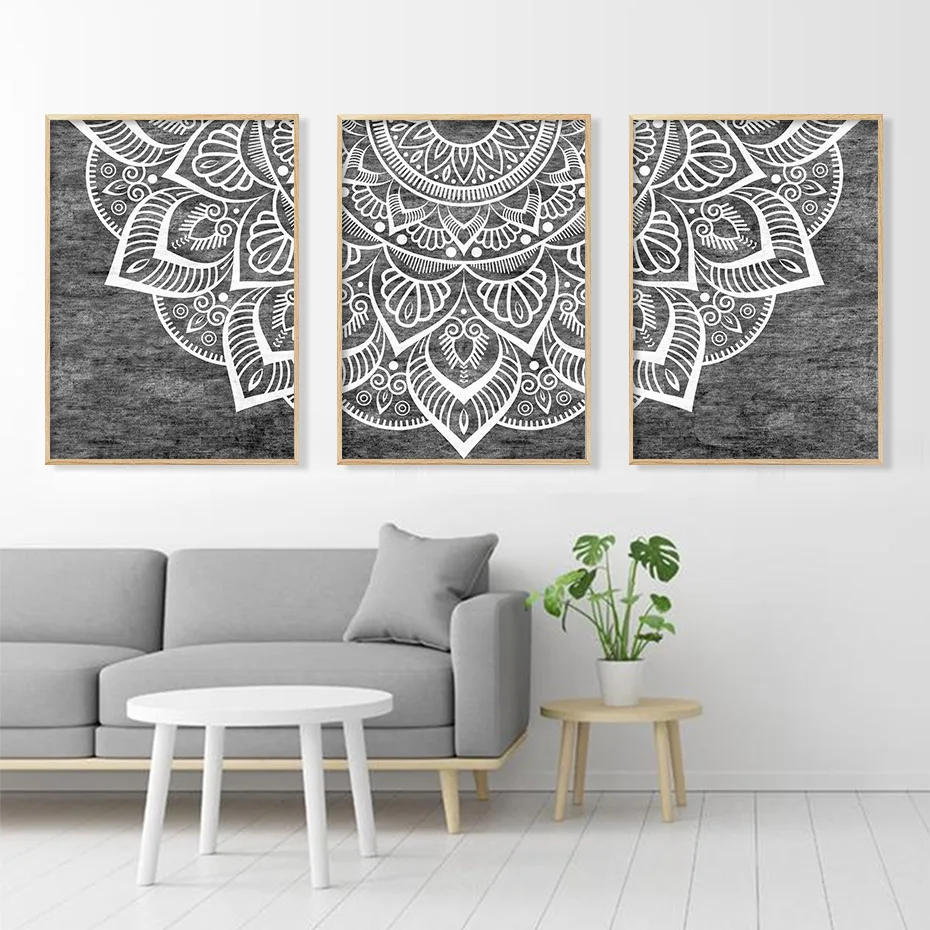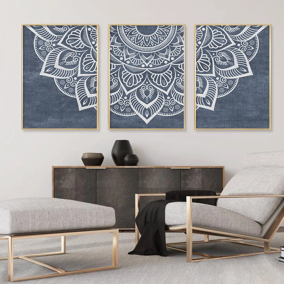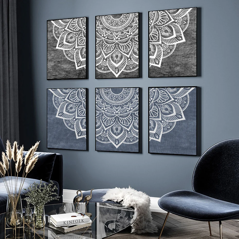 Сине-серая мандала, холст, постер, цветочный узор в стиле бохо, Zen...