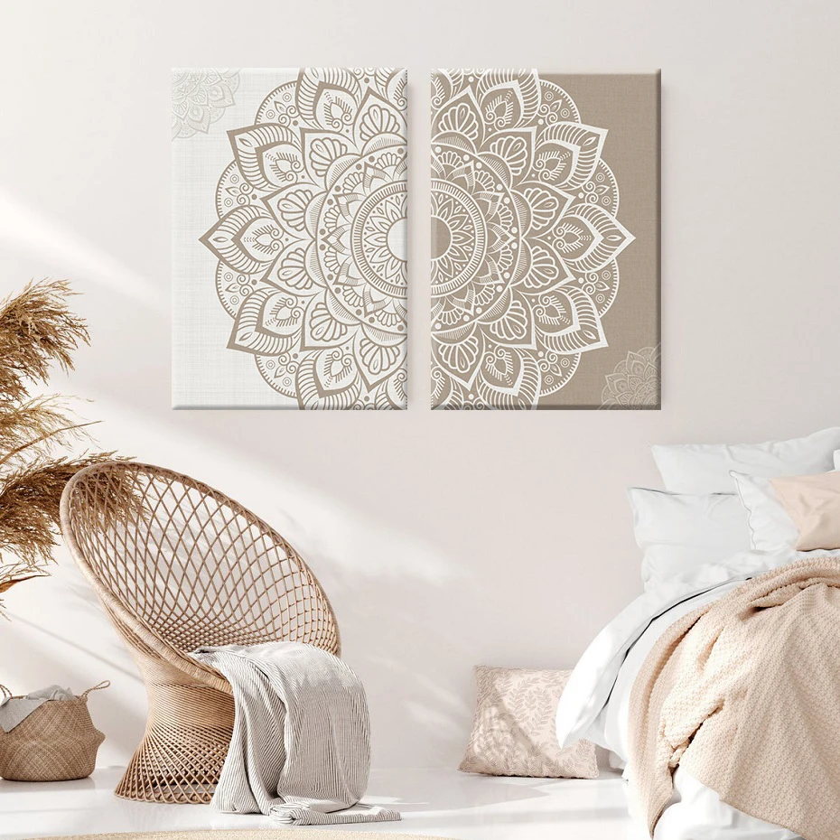 Богемный узор Мандала настенный принт бежевый серый и белый холст к...