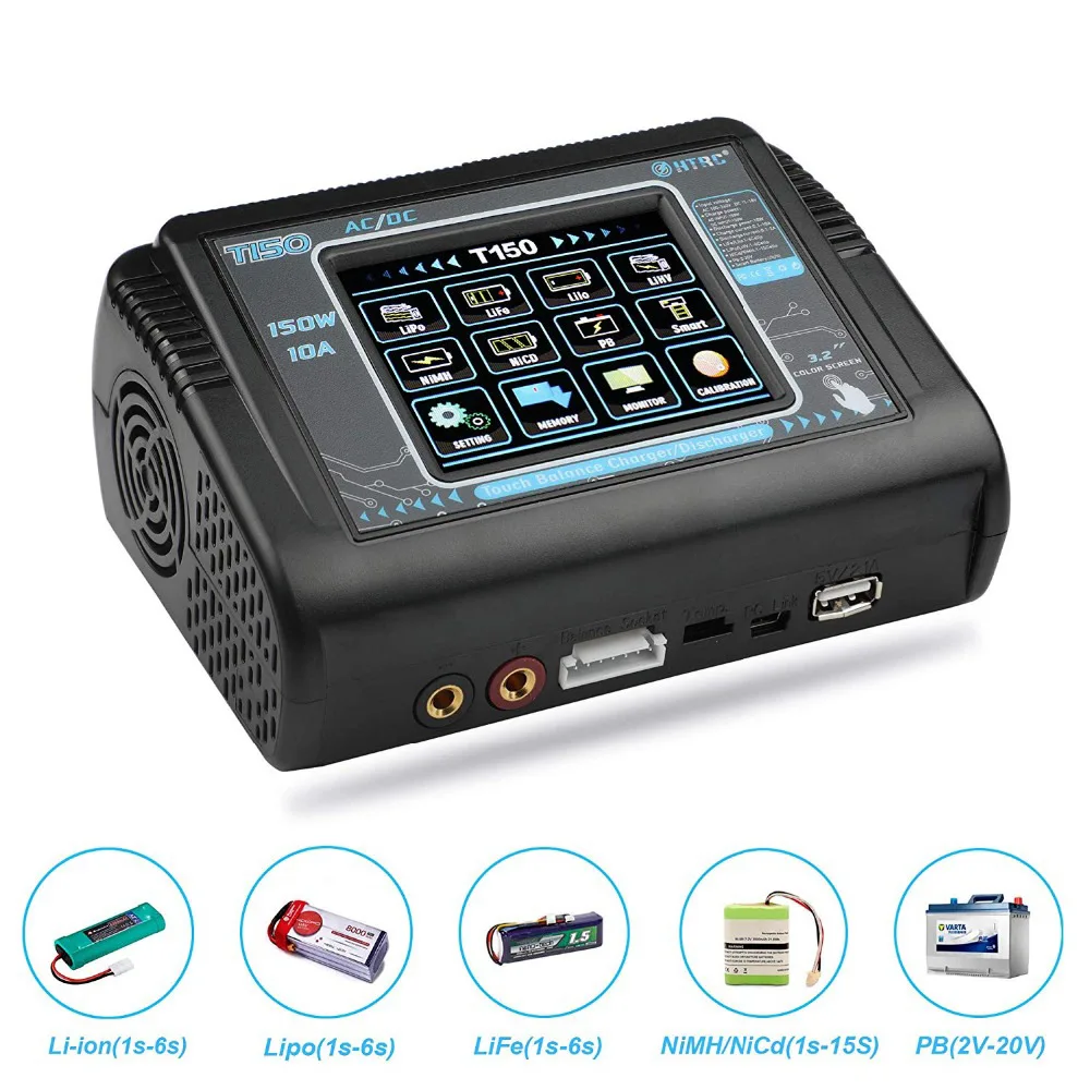 T150 представляет собой новый дизайн мульти-функциональный высокой мощности Баланс зарядное устройство от hтрк, используя 3,2 дюйма цвет ЖК-дисплей дисплей Toch, легкая работа, встроенный вентилятор охлаждения, 11-18 В постоянного тока или 100-240 В переменного тока двойной мощности. Максимальная мощность зарядного устройства 150 Вт, максимальный ток зарядки 10 А. Предназначен для зарядки аккумуляторов LiPo LiFe Lilon LiHV NiCd NiMh Pb Smart.Кроме того, он имеет выходной порт 5 В 2.1A USB DC, который может быть источником питания для других электронных продуктов.Особенности:* Компактное зарядное устройство с сенсорным экраном, легко носить с собой, прост в использовании.* Практичный для различных батарей.* Автоматическая идентификация аккумуляторные ячейки Li-Po* Встроенный вентилятор для легкого рассеивания тепла* График отображения состояния зарядки* Несколько режимов зарядки.-Lipo/Lilo/LiFe/LiHv: баланс заряда, заряда, хранения, разрядки.-NiMH/NiCd: зарядка, разрядка, цикл.-PB: зарядка, разрядка, струйка.: