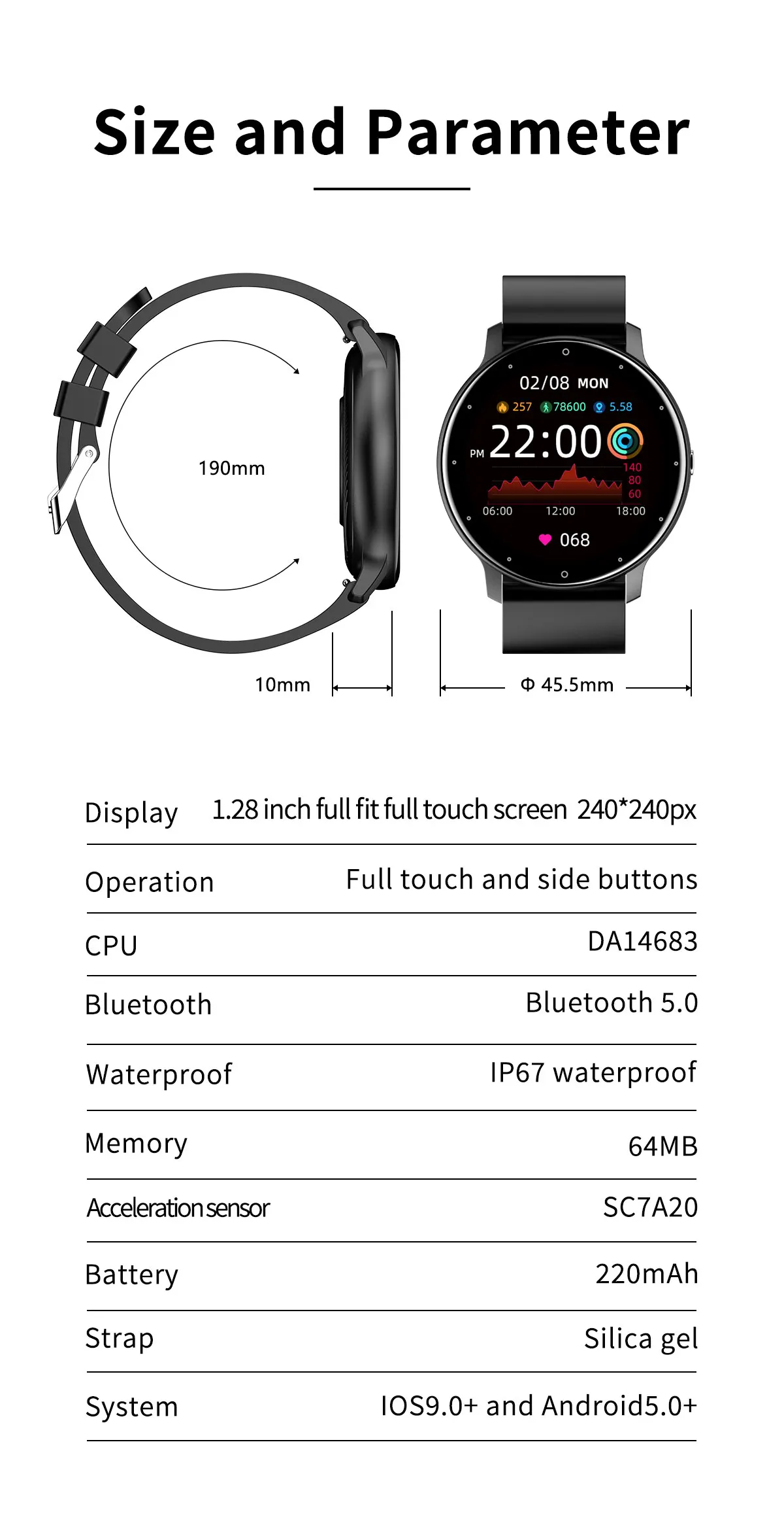 Экран: полноразмерный сенсорный экран 1,28 дюйма 240*240Аккумулятор: полимерный 220 мАчРазмер упаковочной коробки: 15*7,5*3,0 смBluetooth: 4,0Поддержка мобильной версии: iOS 9,0 и выше Android 5,0 и выше
