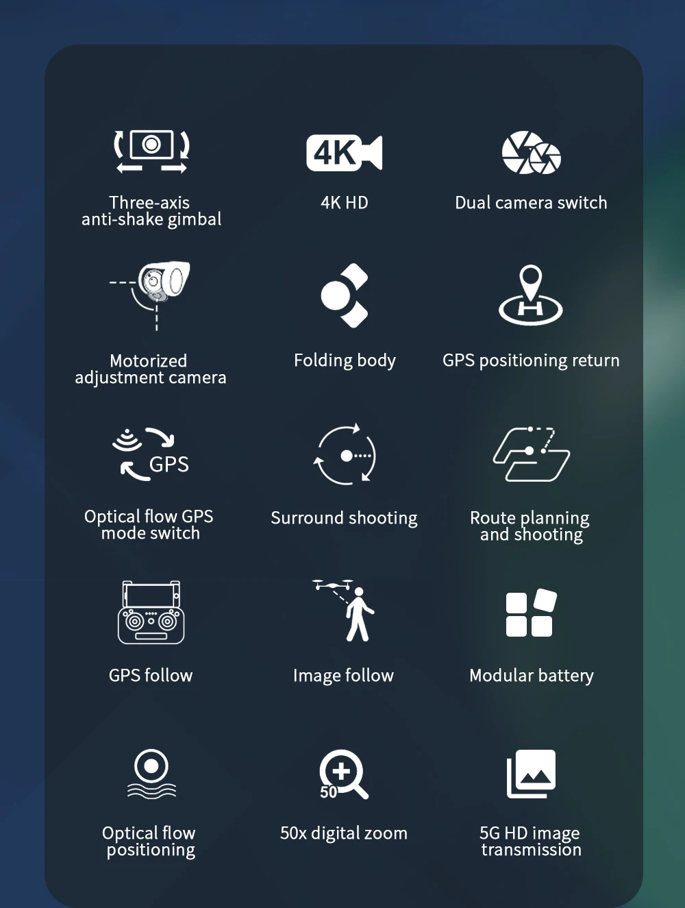 SG907 pro 2 карданный стабилизатор для камеры 70 ° боковая 70 ° автоматический ремонт вертикальный 110 ° 110 ° автоматический ремонт GPS возвращается в взлет точки на одной пуговице, И низкая мощность возвращается в воздух, и нет сигнала на возврат. GPS Smart Follow: после того, как самолет подключается к GPS, функция приложения follow включена, и самолет следует за мобильный телефон. Изображение: 1-5 м от самолета для определения предмета и выполнения автоматического полета. Распознавание Жестов: в пределах 1-5 м от самолета, сделайте жесты камеры/жесты камеры к камере. Многоточечное планирование полета: самолет автономно летает по заданному маршруту, и игрок концентрируется на съемке. Окружность точки: Найдите центр и перемещайте желаемый радиус окружающего света с помощью джойстика. Функция восстановления самолета: непрерывно нажимайте значок gps-сигнала 3 раза, чтобы открыть интерфейс карты, карта показывает конечное расстояние самолета, широту и долготу. МВ Особенности: фильтры, видеоэффекты, фоновой музыки, фотографий/обмена видео можно также использовать для 2 карданный стабилизатор для камеры: 70 ° боковая 70 ° автоматический ремонт вертикальный 110 ° 110 ° автоматическое восстановление Время полета: около 15 мин Время зарядки: около 2 часов расстояние управления (свободное взаимодействие и отсутствие окклюзии):800 м 5G расстояние передачи изображения Wi-Fi (Свободные помехи и отсутствие окклюзии):500M GPS Следуйте за мной: 30M изображение Следуйте за мной: 1-5M Фокусное расстояние: 50x Масштабирование ручная съемка жестов/видеозапись: 1-5 м режим SD: 1208*720 (приложение) режим HD: 2048*1080 (приложение) 4K версия видео разрешение 4K:4096*3072P Фото разрешение 4K:4096*3072P вниз вид камеры: 1280*720p Частота кадров: 25 кадров в секунду емкость интеллектуального литиевого аккумулятора: 7,6 V 1600mAh фиксированная точка объемного анти-встряхивания аэрофотосъемки фото/видео поделиться GPS/ГЛОНАСС двойной Режим посылка включает в себя: 1 х Квадрокоптер шт. зарядный USB кабель-1 шт. 1 x пульт дистанционного управления 1 х Отвертка 4 х лезвия 1x7,6 V 1600mAh Li-po Батарея (1 шт.); Руководство по эксплуатации