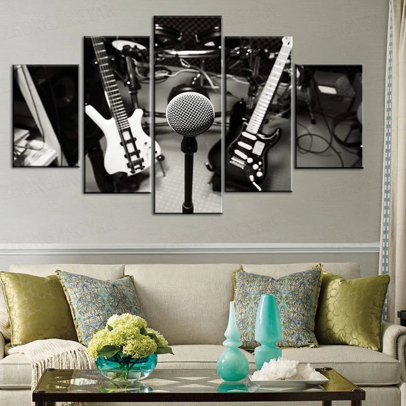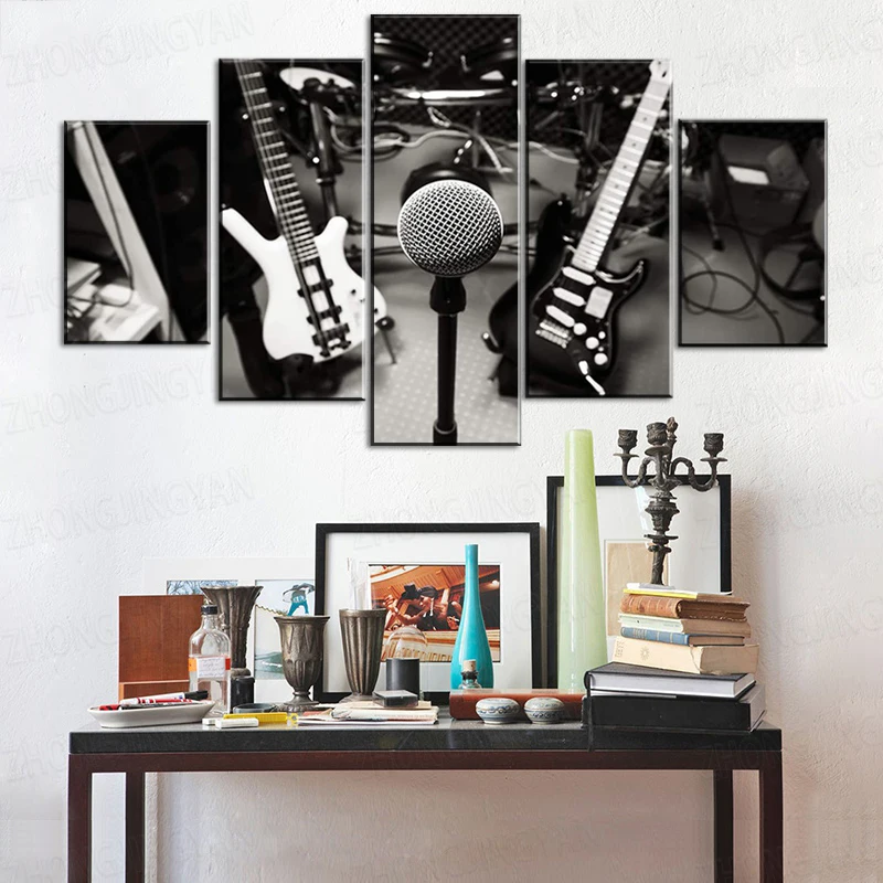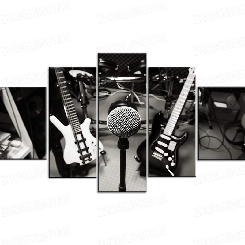 5 панелей избирательный фокус музыкальный инструмент микрофон, электрогитара, барабан, бас настенное искусство Черный Белый Холст принты домашний декор