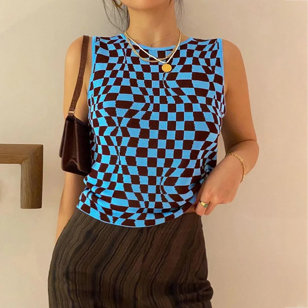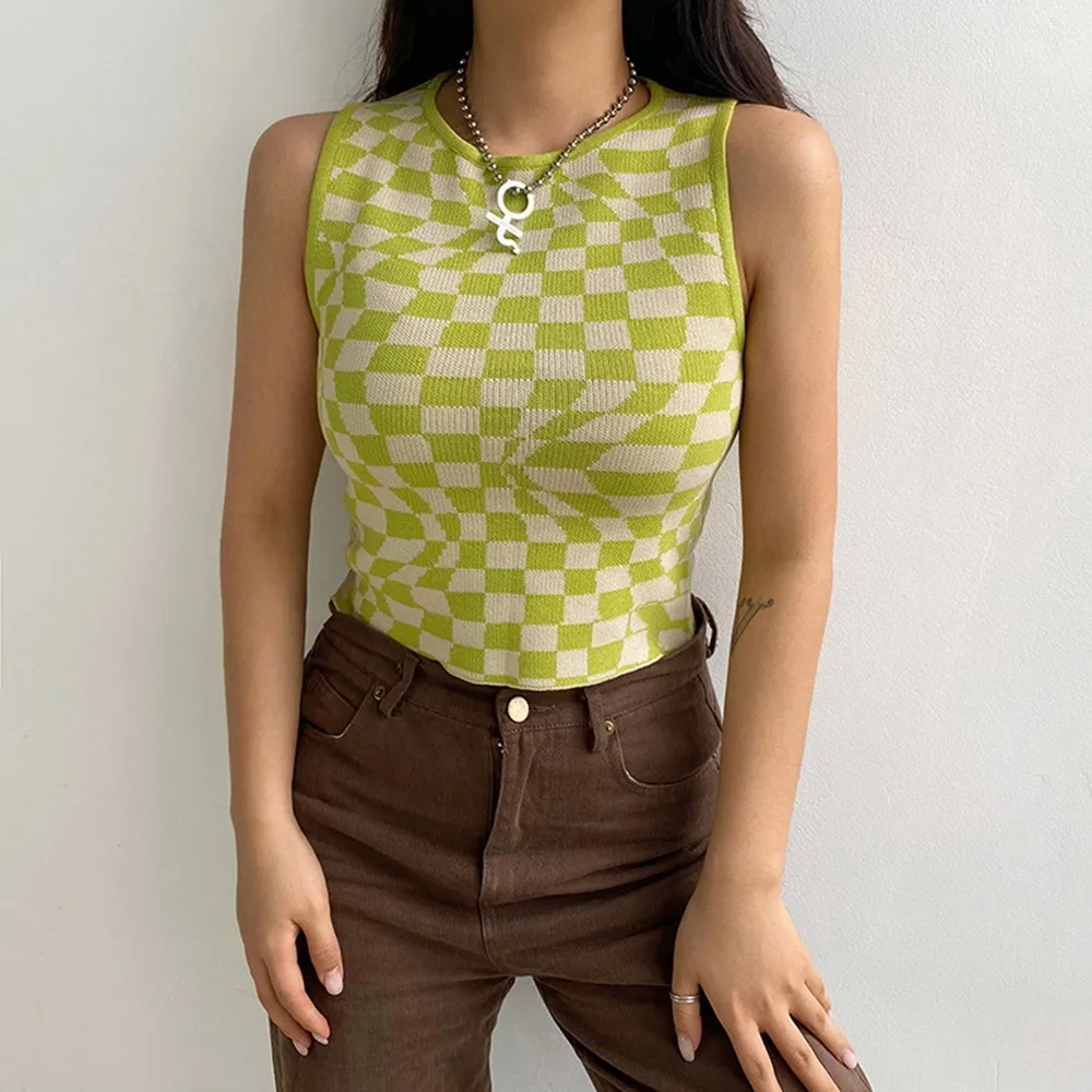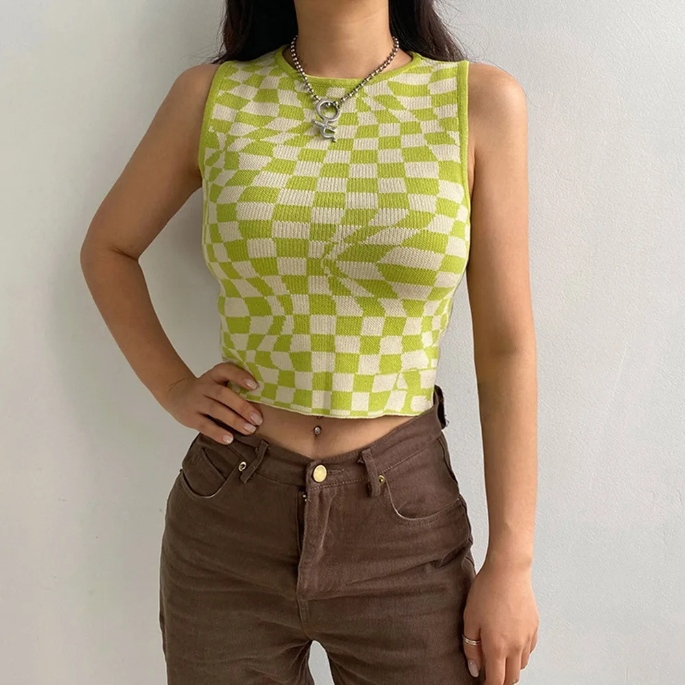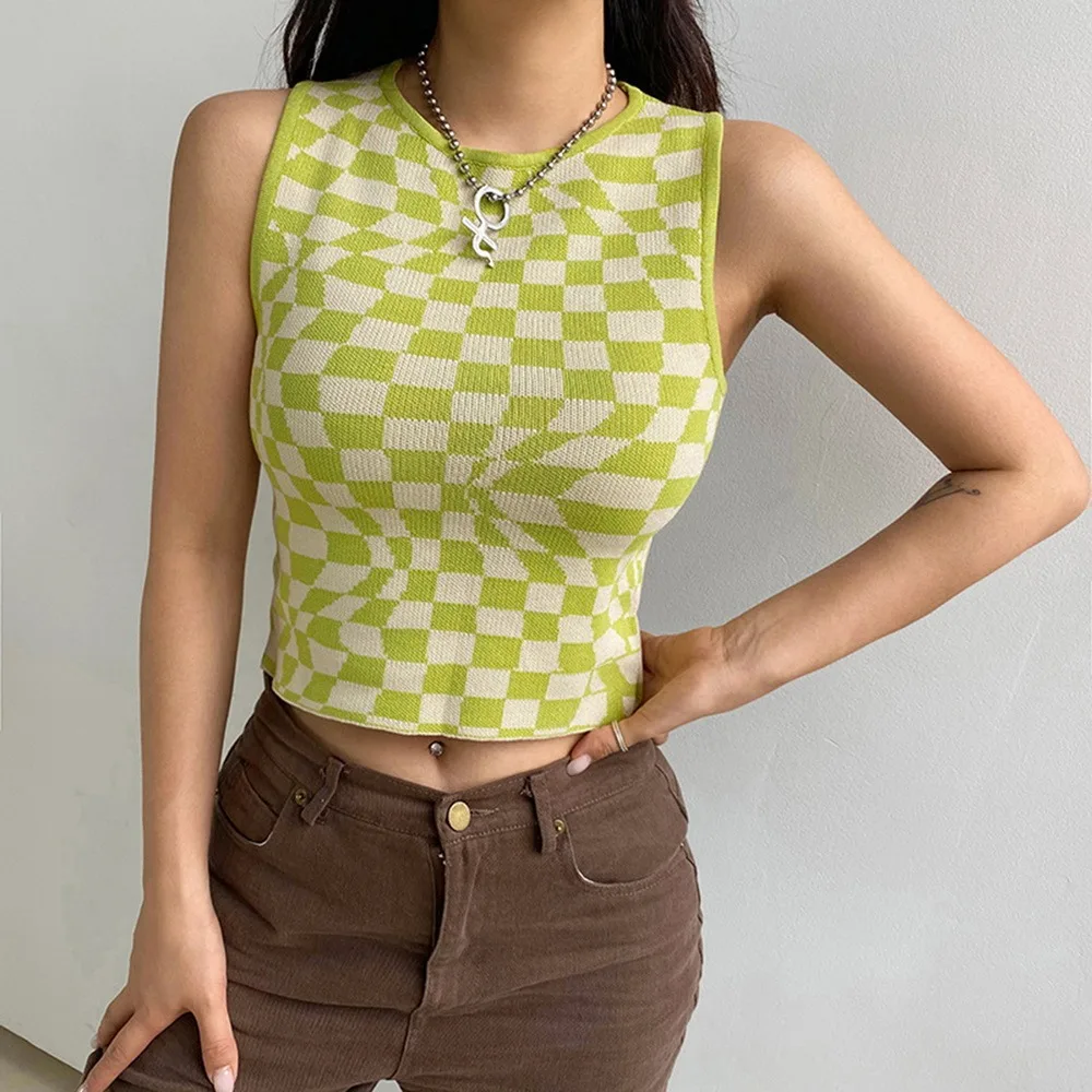Кроп-топ женский трикотажный без рукавов, базовая Повседневная клетчатая майка в клетку, уличная одежда, Винтажная Майка, Y2K, на лето