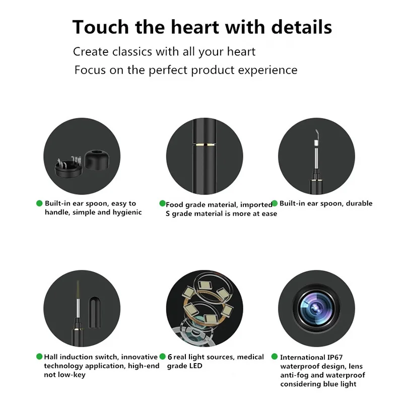 Богатый набор аксессуаров, больше функций камеры s: в дополнение к основной камере посылка содержит множество аксессуаров, В том числе 2 * Ушная Ложка 2 * Боковые ушные ложки 2 * массажные ушные ложки 2 * Длинная Массажная палочка 2 * пуховая палочка 1 * наушники, используемые для проверки и очистки ушного воска, ушного канала, барабанной перепонки, Не только хороший помощник для ваших ушей, но и идеальный инструмент для вашей собаки, кошки.