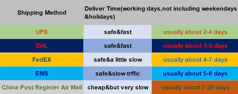 Внимание: Бесплатная доставка Почта Китая авиапочтой, обычно 14-30 дней, иногда это занимает длительное время 50-60 дней, поэтому, пожалуйста, будьте терпеливы, если вы не получите ems быстро перед доставкой, или вы можете выбрать EMS,DHL,UPS,FEDEX. Пожалуйста, свяжитесь с нами, если вы хотите другой экспресс-сервис.