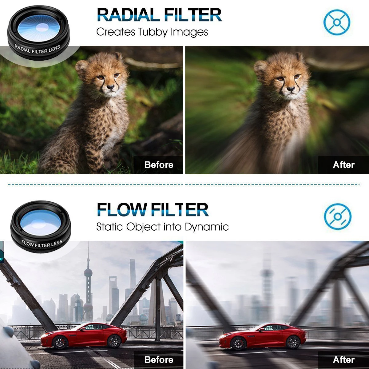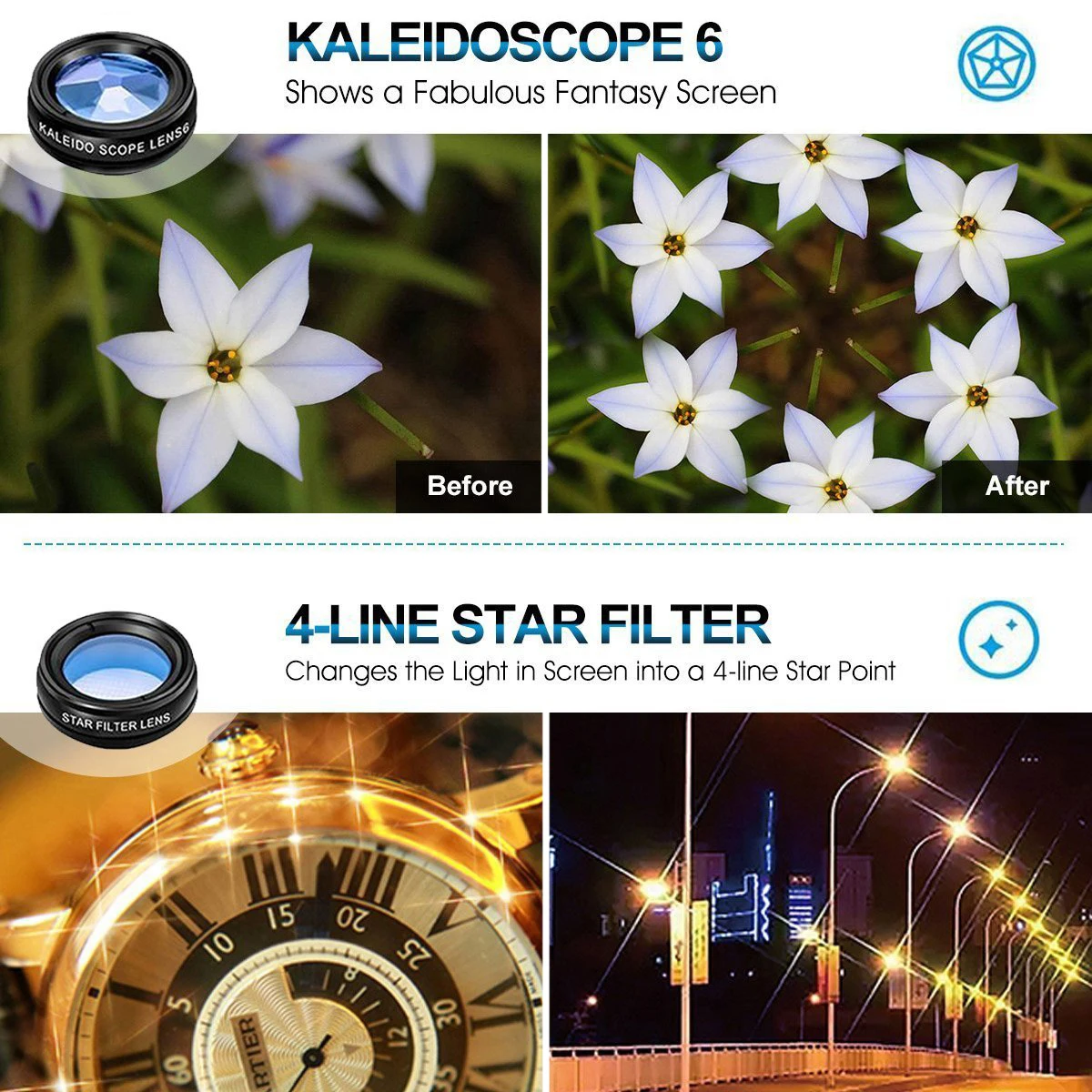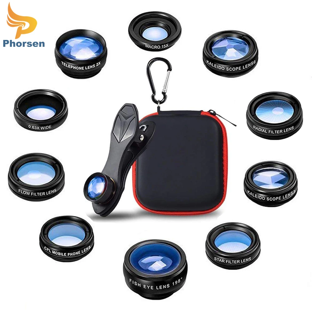Универсальный комплект объективов для телефона 10 в 1, широкоугольный объектив с зажимом для телефона + макрообъектив + объектив рыбий глаз + телеобъектив + калейдоскоп 3/6 объектив + CPL/Flow/Star/Radial фильтр для iPhone Samsung большинство смартфонов