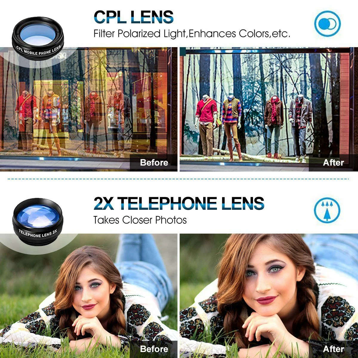 【Профессиональный объектив камеры Kit】: включает в себя 0.63X широкоугольный объектив, 15X макро объектив, 198 ° объектив «рыбий глаз», 2X телеобъективы, 3/6 калейдоскопы, 4-строчный Звездный фильтр, CPL фильтр, фильтр, радиальным фильтром 【Различные Эффекты изображения 】: широкоугольный объектив отлично подходит для групповых снимков. Линзы Рыбий глаз создают забавные круговые фотографии. Макро-объектив захватывает удивительные close-ups.Telephoto линзы для съемки изображения расстояния и размывания фона. Звезда fliter, чтобы добавить драматическую звезду к очень ярким зонам. Линза калейдоскопа показывает вам 3/6 перекрытие зрения. Объектив CPL устраняет отраженный светильник и создает красивый цвет. 【 Портативный и простой в использовании 】: Портативный и съемный Универсальный объектив с зажимом. Установите зажим на камеру телефона и убедитесь, что объектив выровнен с объективом камеры телефона. Снимайте изображения с помощью нашего набора объективов для камеры телефона, наслаждайтесь техническим эффектом изображения. 【Портативный багаж: сумка для хранения очень прочная и портативная. Легко носить с собой, когда вы находитесь на улице, и обеспечивает дополнительную защиту объектива, которая предотвращает удары и водонепроницаемость объектива телефона. Уникальный дизайн упаковки также является хорошим выбором в качестве подарка. 【Широкая Совместимость 】: уникальный зажим дизайн совместим с большинством смартфонов и мобильных устройств, включая iPhone 8/8Plus/7/7Plus/6/6Plus Samsung Galaxy S9 S8 S7 A3 A5 J330 J530 Huawei P10/P10 плюс Sony xperia L1 XA1 XZ LG K8 iPad, планшет и большинство смартфонов. Примечание: Макро Лен и широкоугольный лен крепятся вместе, пока вы их получаете Для каждого идеального момента Наслаждайтесь портретными снимками, панорамами и вистасами, большими групповыми фотографиями, особых случаев, концертов, каникул и т. д. Характеристика: Макрообъектив-приблизит вас к 15X для экстремальных close-ups.Explore природы с огромным количеством. Он идеально подходит для крупным планом снимков насекомых, ювелирных изделий, монет, растений и многого другого. Широкоугольный объектив-открывает поле зрения для захватывающих пейзажных фотографий или селфи. Подходит для всей семьи или всей команды на картинке. Телеобъектив-позволяет вам в 2 раза приблизиться к действию Объектив рыбий глаз 198 °-он дает вашим изображениям круглый эффект, а также выступает в качестве широкоугольного объектива Линза калейдоскопа-вы несомненно получите уникальную перспективу своего мира через глаза Дракона. Звездный светофильтр-точечный светильник Star cross screen фильтр для объектива камеры телефона создает точки светильник, такие как «звезды», просвечивающийся наружу из центрального источника светильник. Это может сделать светильник на сцене более блестящим, гламурным внешним видом. Радиальный фильтр-позволяет снимать радиальный визуальный эффект, который поможет вам легко запечатлеть фото с визуальным воздействием. Фильтр потока-превращает статический объект в динамические эффекты, нет необходимости в любом программном обеспечении изображения, вы можете сделать потрясающее и креативное фото. Объектив CPL-при съемке на открытом воздухе под солнечным светом поляризационный фильтр удалит нежелательные отражения, отскакивающие от объектов на фото, устраняя блики при данном снимке Коробка сод