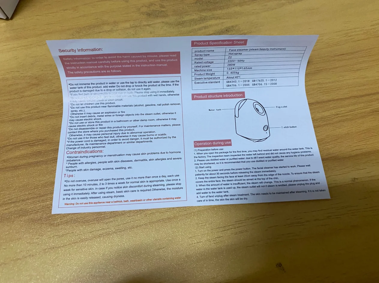 Работает как следует, быстро нагревается и питается горячим паром, оптимально парит лицо на расстоянии 15-20 см. Нет автоматического отключения, вам нужно быть аккуратным, выключить устройство вовремя, когда вода закончена. Работает в срок около 8-9 минут при заполнении полной флягой (50 мл). Доставка в течение 6 дней до двери.