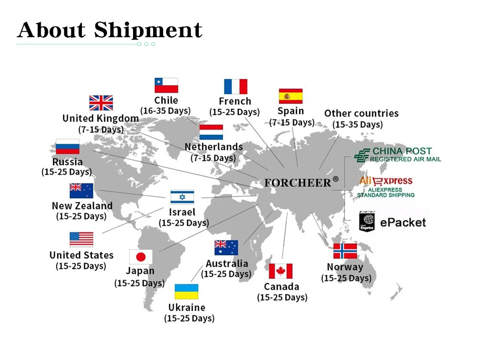 1. Мы отправляем все заказы в течение 5 дней из-за некоторых проверок безопасности на aliexpress.com. Срок доставки может быть продлен из-за праздников. 2. Ваш продукт будет доставлен Вам в течение 10-60 дней. Для стран, где мы получаем меньше заказов, срок доставки будет 120 дней. 3. Мы берем на себя ответственность за неправильную доставку и проблемы с качеством товара. 4. Компания не несет ответственности за уплату каких-либо таможенных пошлин в стране назначения. 5. Требуемая информация, включая адрес, почтовый индекс, номер телефона и номер мобильного телефона, должна быть полной и точной. 6. Для любого российского национального клиента, пожалуйста, укажите свое полное имя для полной доставки ваших товаров. 7. Для оптовых дилеров рекомендуется связаться с нами напрямую для получения наилучших цен, а также скидок на доставку. 8. Зарегистрированная Авиапочта Почта Китая используется для отправки ваших товаров в США, Европе и других частях мира. Обычно это Доставка занимает от 15 до 45 рабочих дней. Если общая сумма покупки превышает $180, EMS или DHL будут нести ответственность за Доставка ваших продуктов вам. Если у вас есть любимая доставка, пожалуйста, свяжитесь с нами и дайте нам знать.