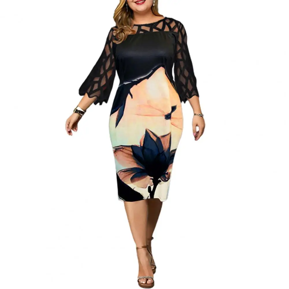 Женское Сетчатое платье до колен, элегантное облегающее платье составного кроя с круглым вырезом, рукавами размера плюс и цветочным принтом, для вечеринок, 34