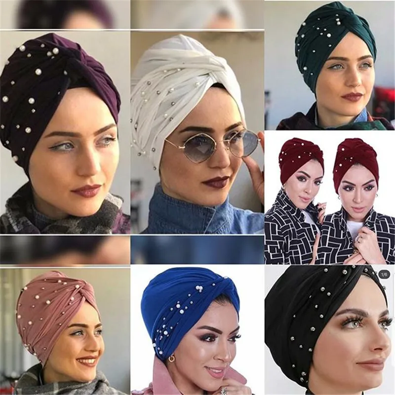 Мусульманин бисером хиджаб шарф Для женщин Твист тюрбан шапка-тюрбан mujer Индия головка Обёрточная бумага шарф стрейч Шапочка Капот химио тюрбаны
